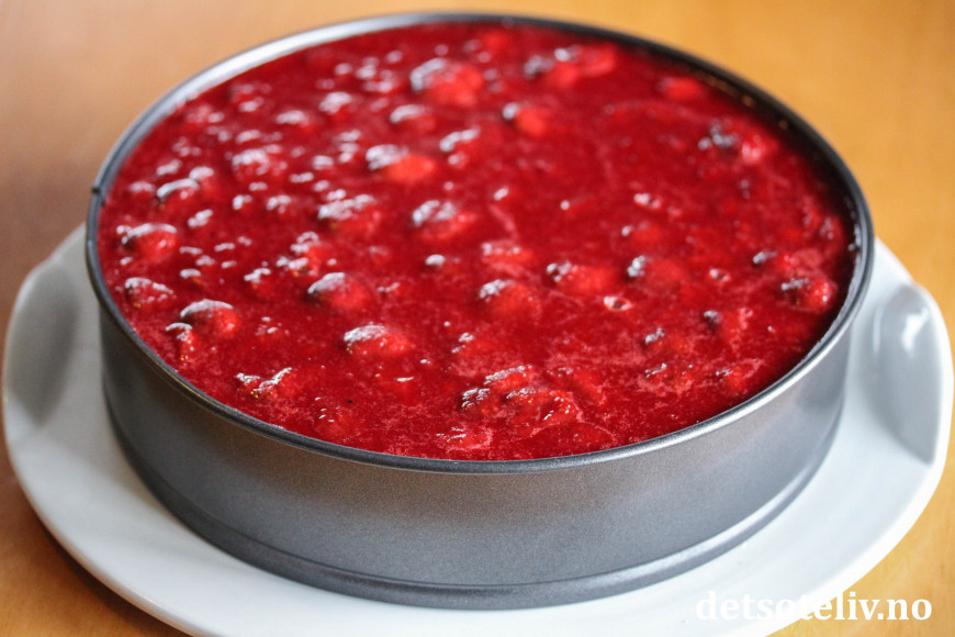 Ha jordbærene deretter over ostekaken og sett formen tilbake i kjøleskapet i noen timer (eller over natten) til jordbærlokket har stivnet.