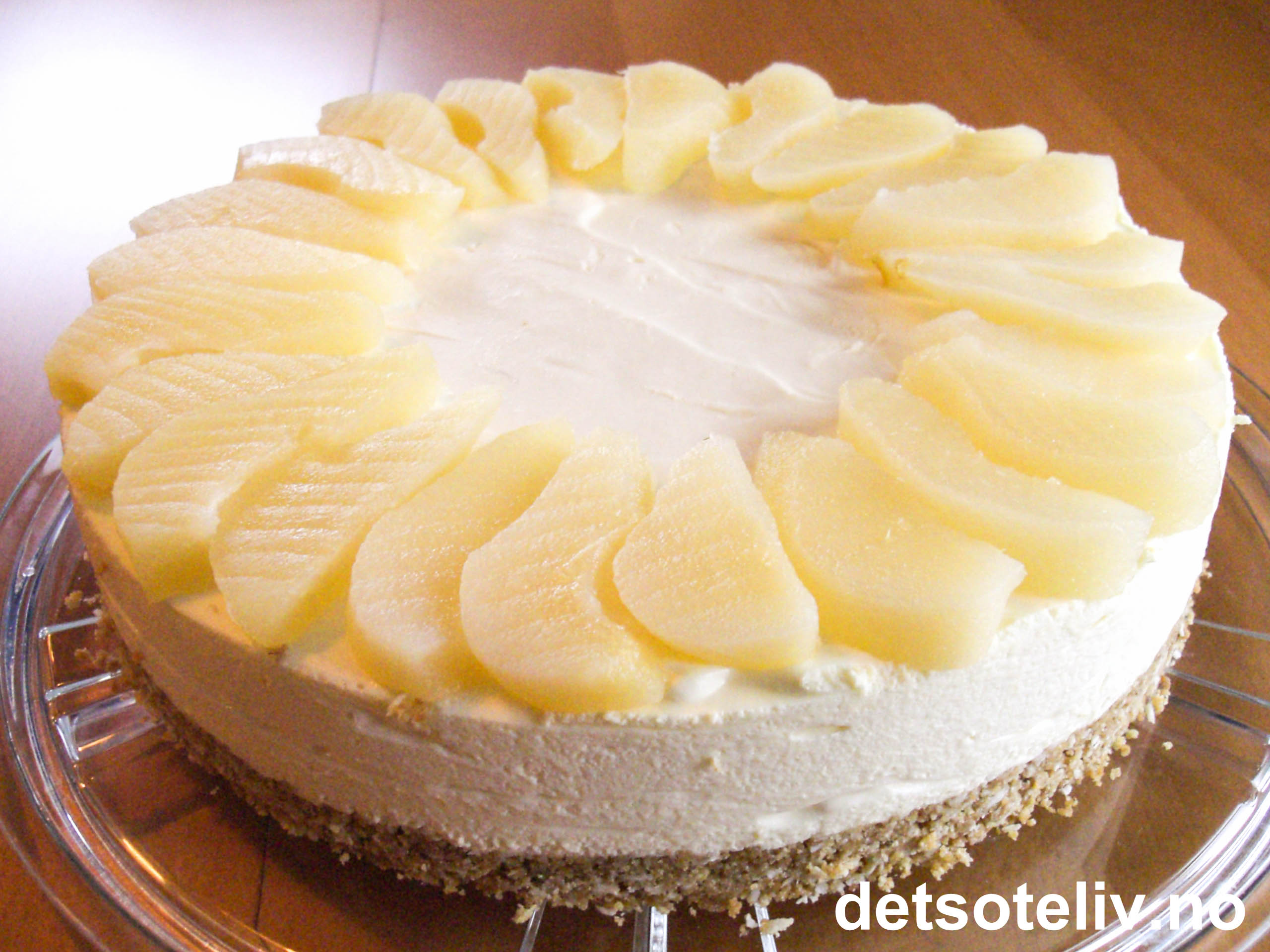 Skjær forsiktig langs kakeringen med en kniv og fjern kakeringen. Pynt kaken med godt avrente hermetiske pærer oppdelt i skiver.