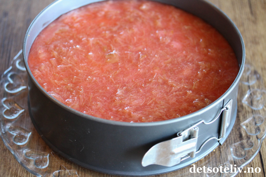 Fordel den kalde rabarbrakompotten på toppen av kaken. Sett kaken tilbake i kjøleskapet i noen timer, til rabarbralokket har stivnet.