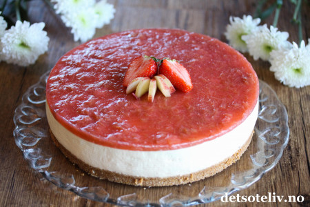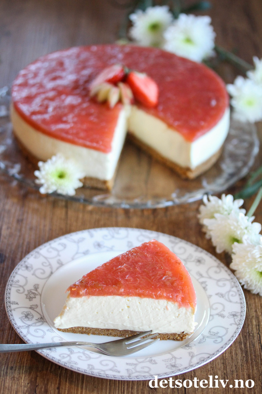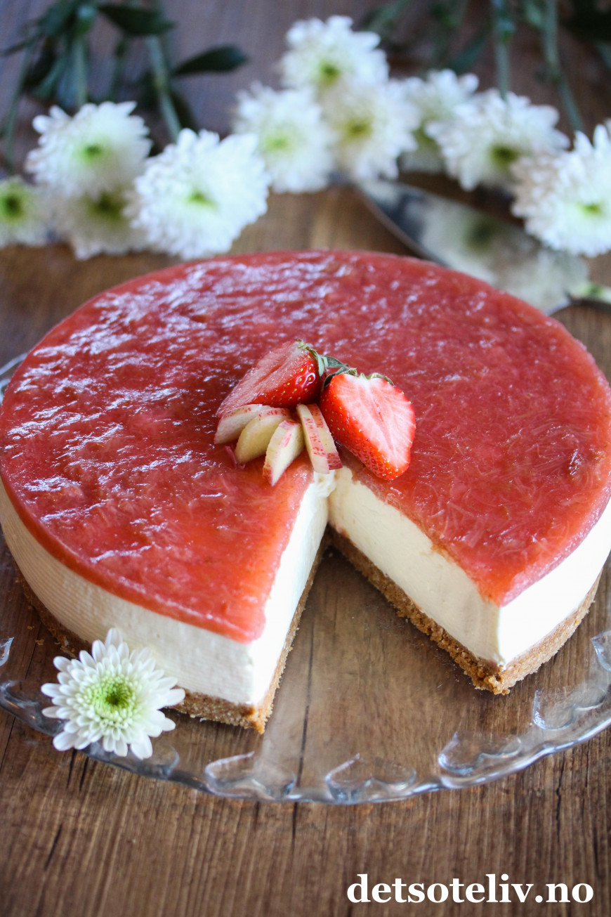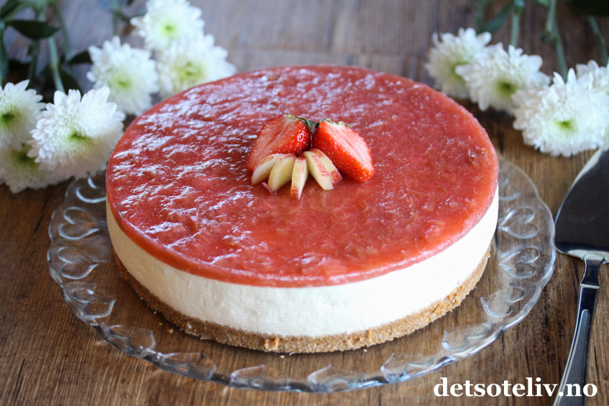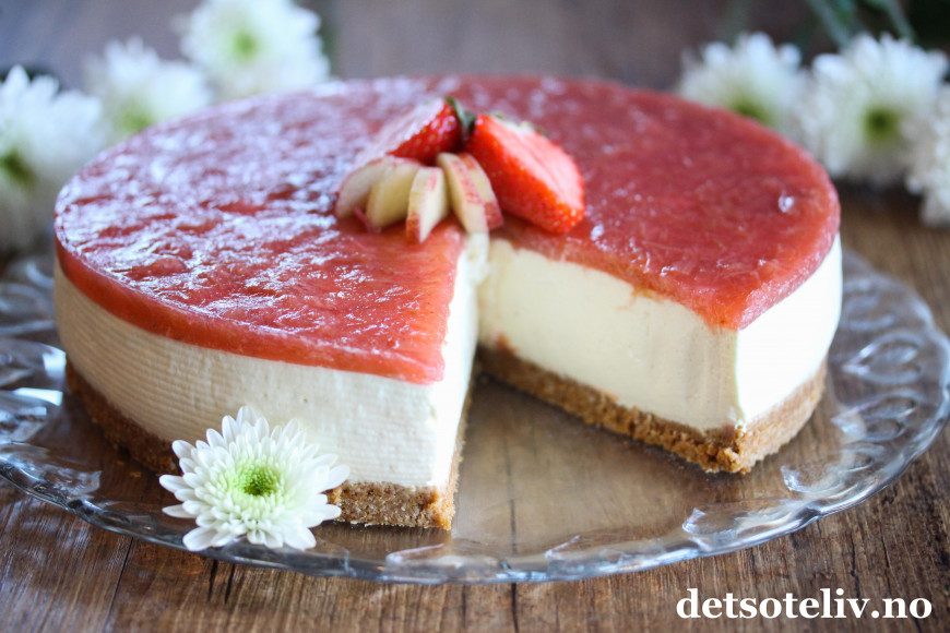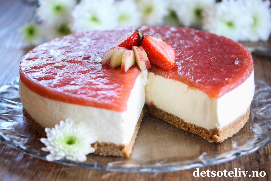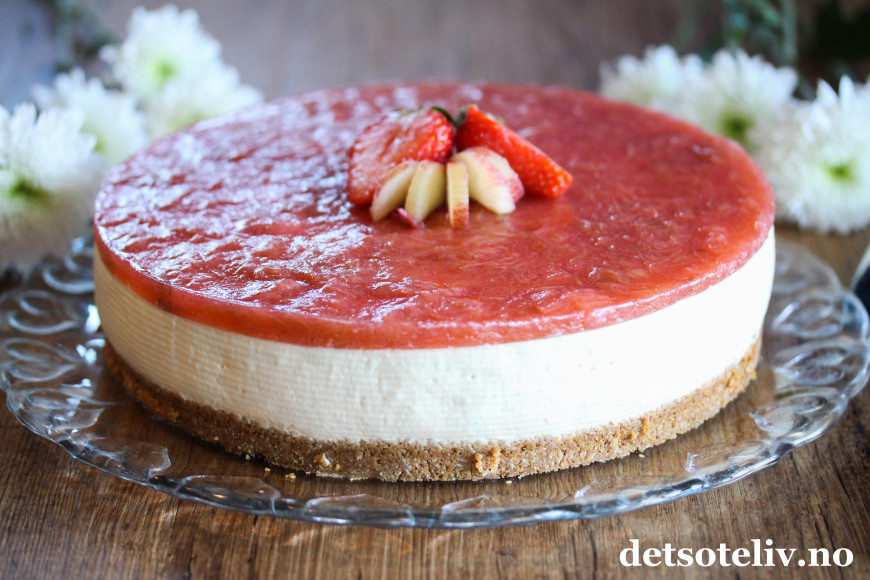 Her skal du få en litt original vri på en klassisk ostekake. Jeg toppet kaken med hjemmelaget rabarbralokk, som smaker fantastisk sammen med ostekaken. I tillegg til rabarbra har jeg brukt litt jordbær, som gir sødme og sikrer vakker, lyserød farge på kaken.