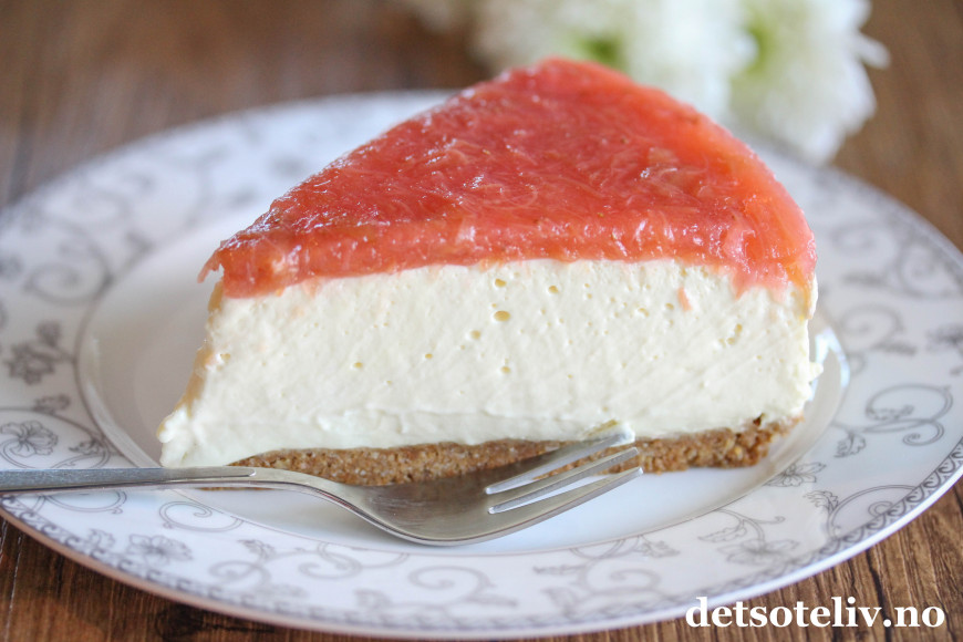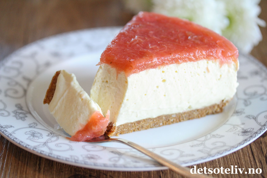 Ostekake med perfekt, kremete konsistens og så det herlige, litt syrlige rabarbralokket på toppen. ♥