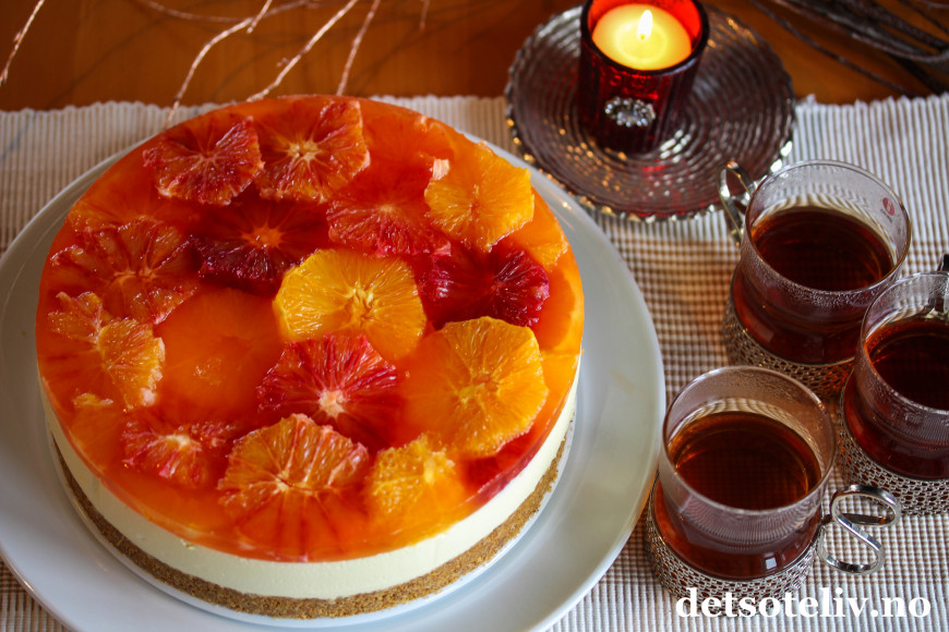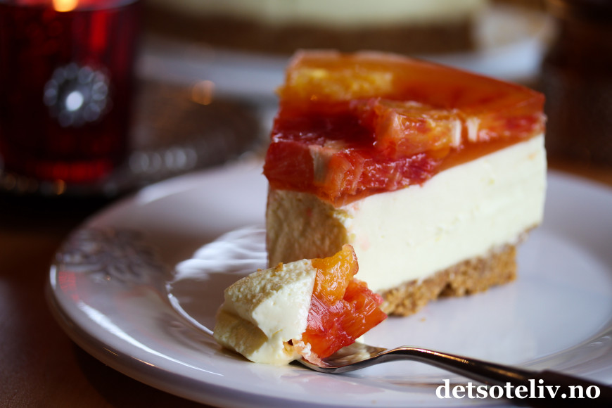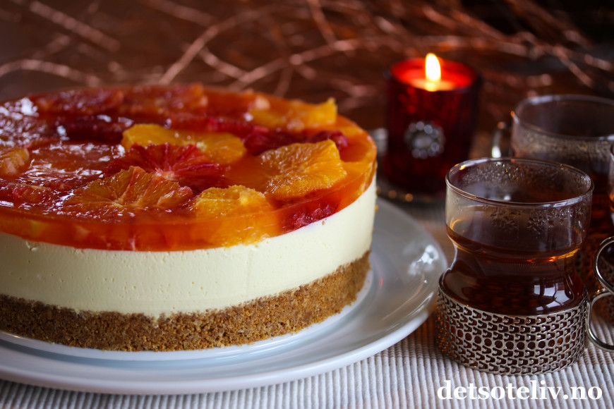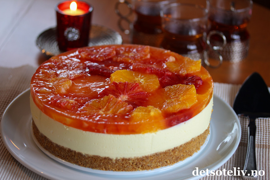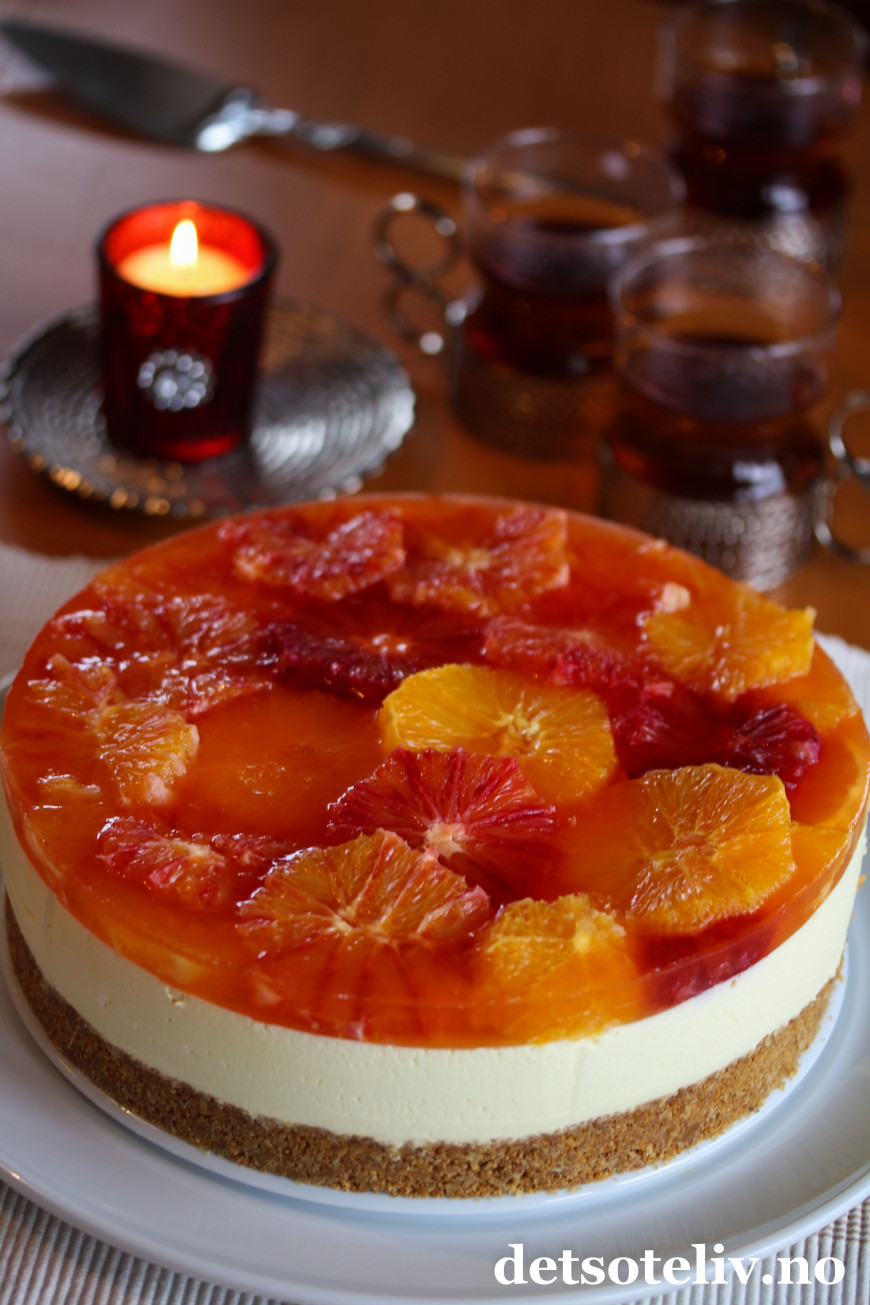 Variasjonen på røde appelsiner gjør at det blir ekstra dekorativt å pynte med appelsinskivene, slik jeg har gjort på denne ostekaken her.