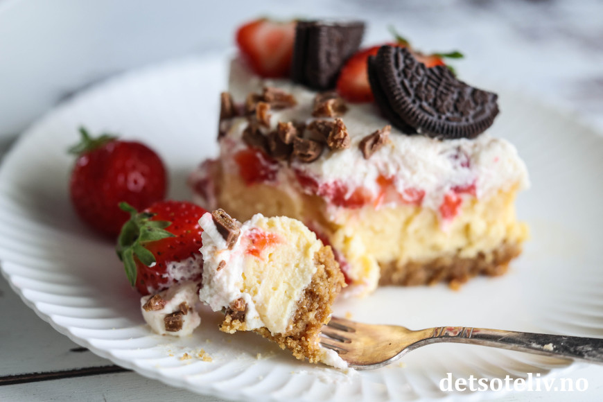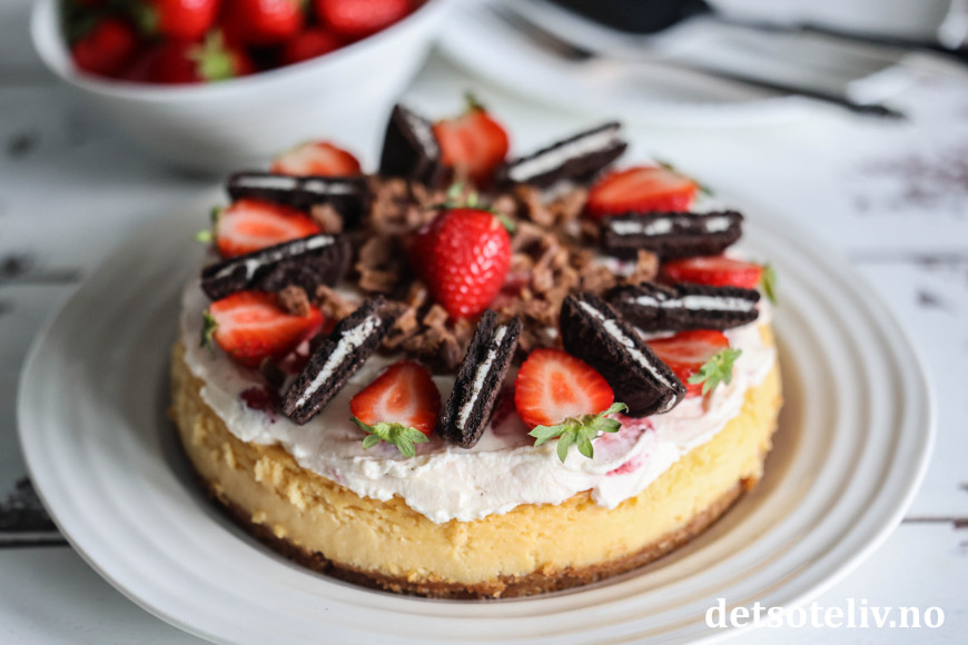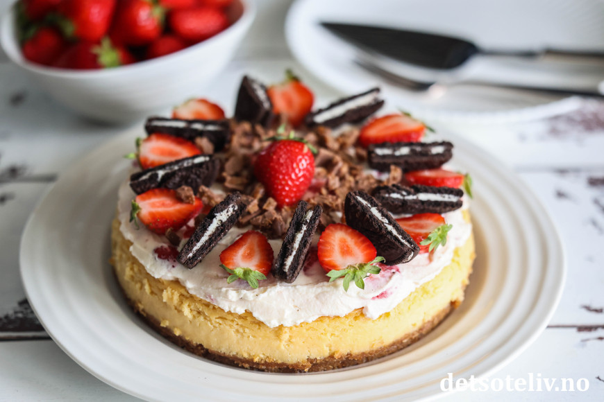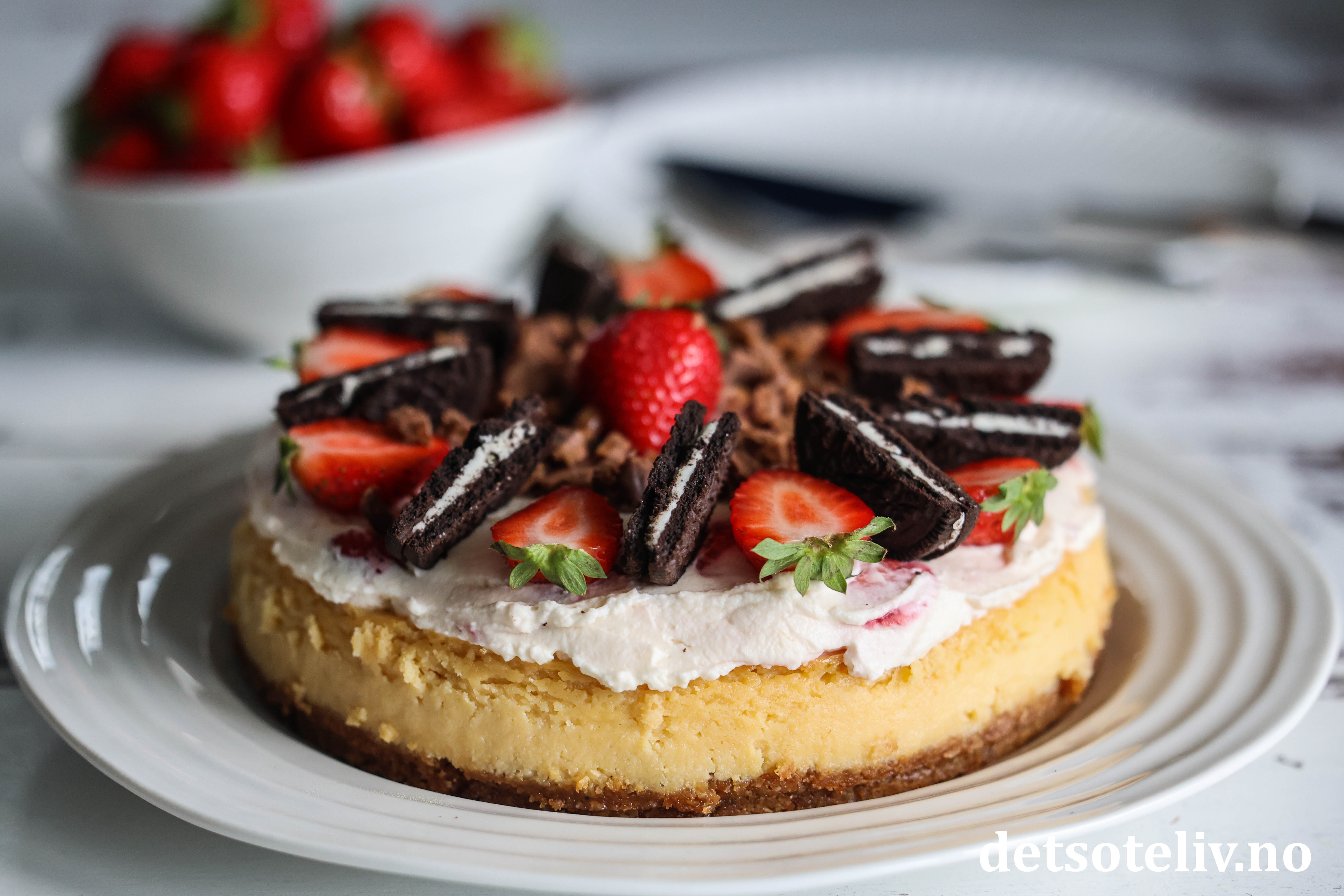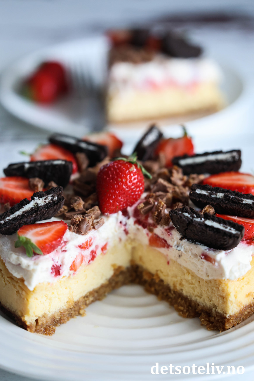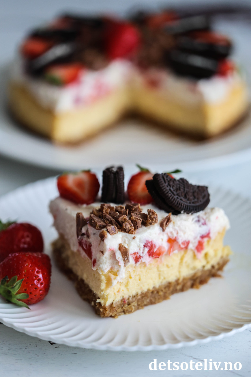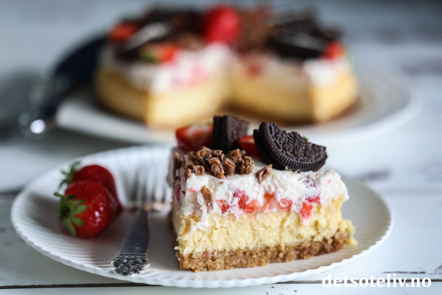 Pynt kaken med friske jordbær, halve Oreokjeks og hakket Daim.