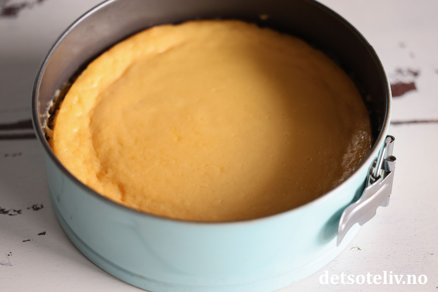 Hell ostefyllet over kjeksbunnen i formen. Sett formen tilbake midt i ovnen ved 175°C og stek kaken i 25 minutter.