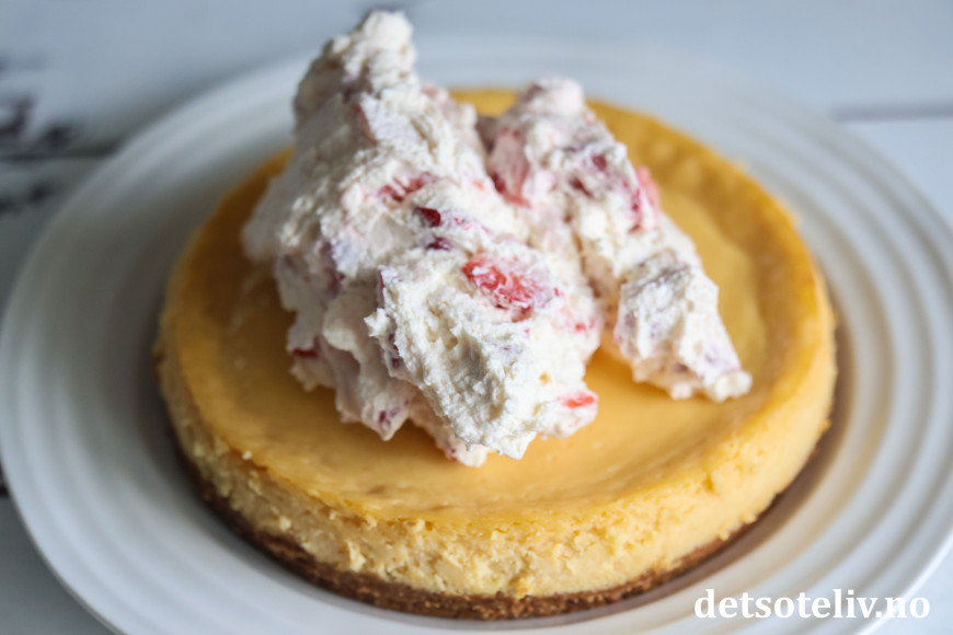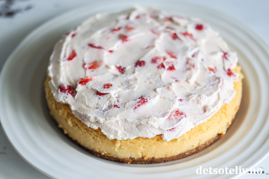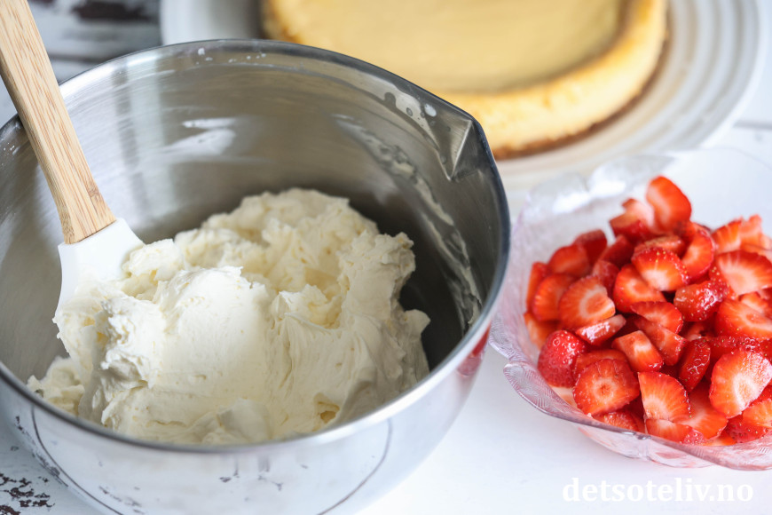 Ostekaken dekkes med en nydelig jordbærkrem laget med kremfløte og mascarpone.