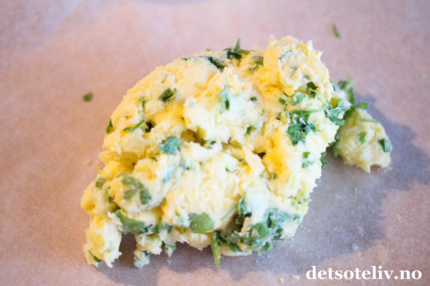 Ha smøret deretter på et stykke bakepapir, form en pølse og surr papiret godt rundt. Sett i kjøleskapet. Ta smøret gjerne ut av kjøleskapet noen minutter før servering så det ikke blir for hardt.