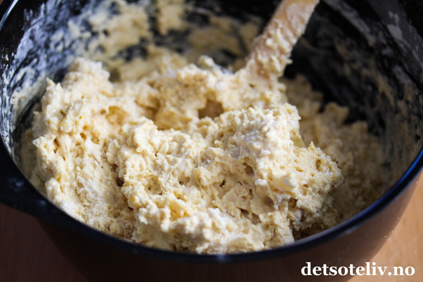 ♥ Det er viktig at du ikke rører for mye i deigen, for da blir den seig. Bruk for all del ikke kjøkkenmaskin. Deigen skal bare røres raskt og varsomt sammen for hånd.