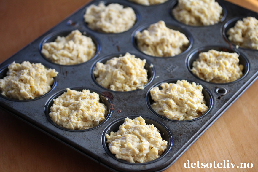 Finn frem et muffinsbrett og spray det godt med formfett. Fordel deigen i formen ved hjelp av to spiseskjeer.