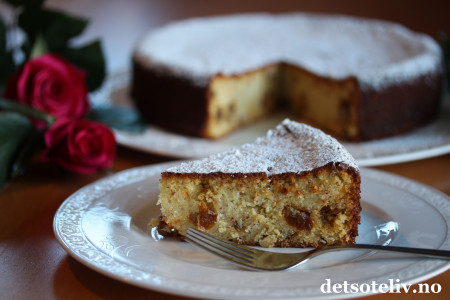 Ha deigen i en rund, smurt form (24 cm i diameter) med bakepapir i bunnen. Stek kaken nederst i ovnen ved 190°C i 1 time (dekk til kaken med et stykke bakepapir om du synes den blir for mørk på toppen). Slå av varmen på ovnen, og la kaken bli værende i ovnen i 1 time til.
