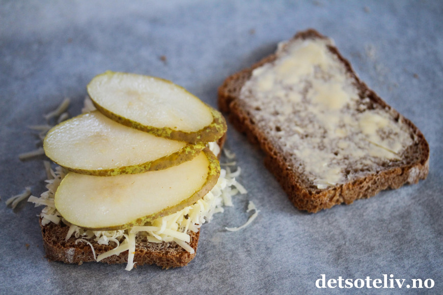 Legg pæreskiver oppå gulosten.