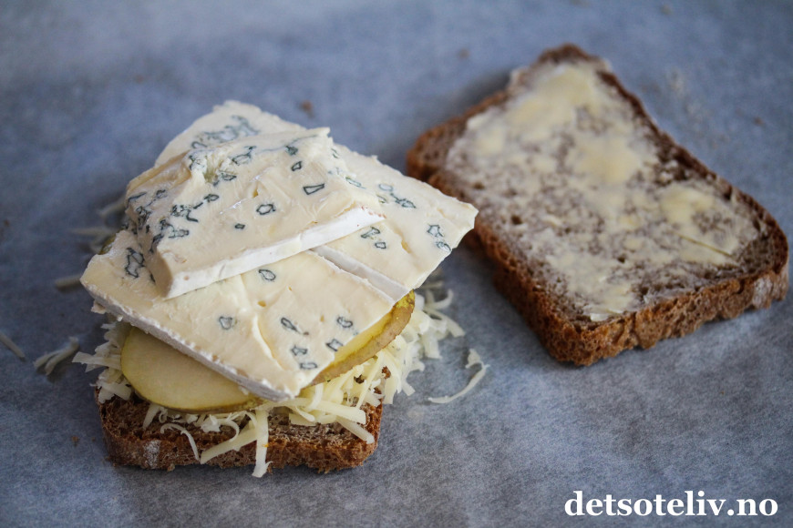 Legg pæreskiver oppå gulosten. Dekk deretter med tykke skiver Cambozola.