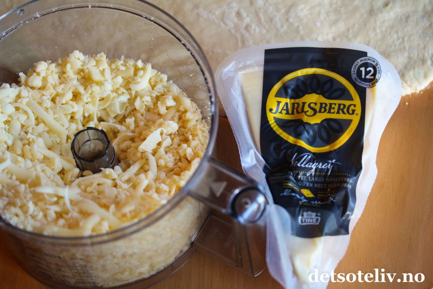 Riv Jarlsberg til fyllet. Jeg brukte rivefunksjonen på food processoren min, men å rive osten for hånd på vanlig rivjern går selvsagt like fint.