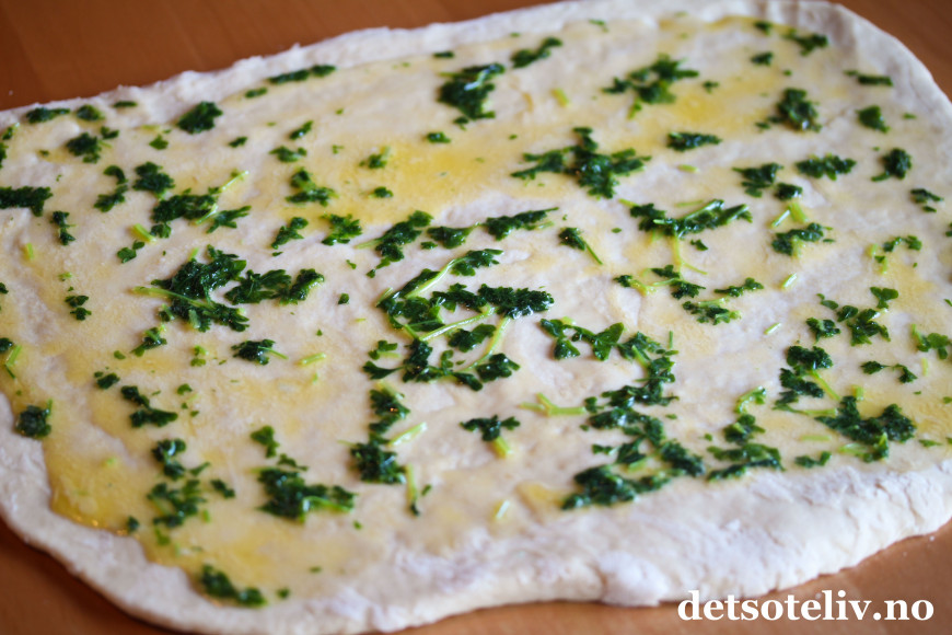 Når deigen er ferdig hevet, kjevles den ut til et stort rektangel. Pensle over med godt over halvparten av urtesmøret.