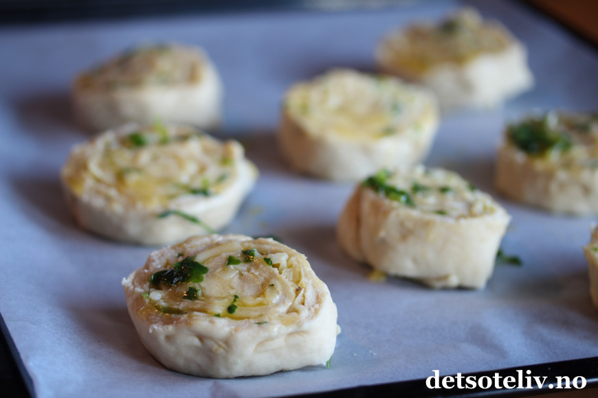 Dette er noen av de beste snurrene jeg har laget - og spist. Lagde denne porsjonen en gang før, og den kom aldri ned i fryseboksen. Selv husgubben som ikke er spesielt fan av hvitløk, blir sulten når jeg begynner med disse. Så nå står en ny runde til heving. Helt herlige - anbefales varmt!