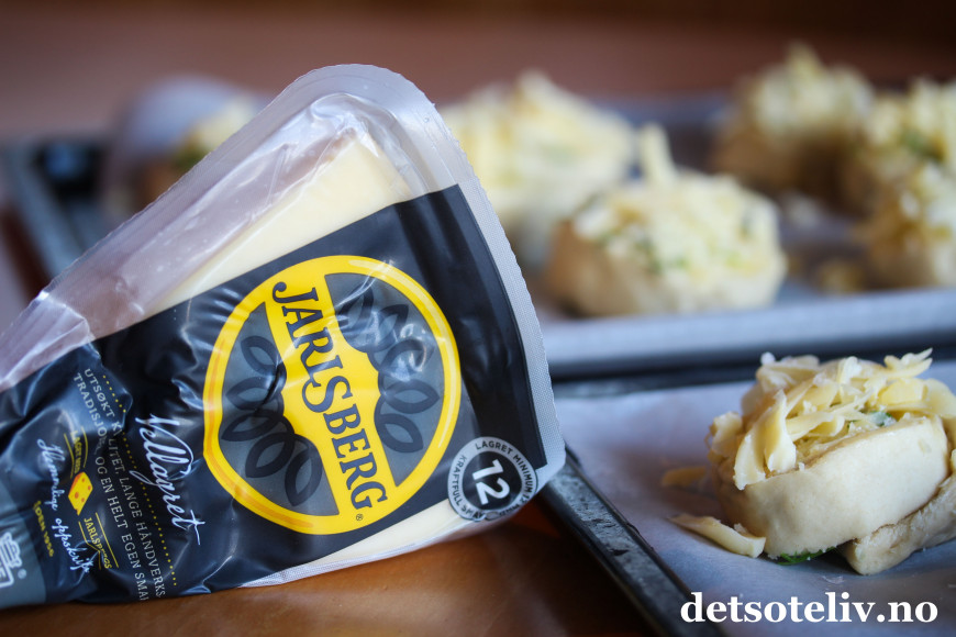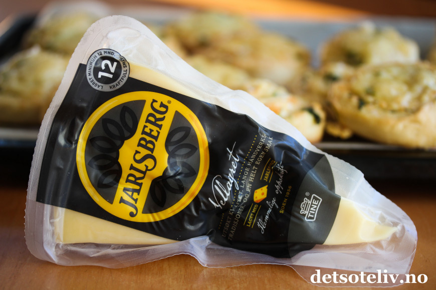 ♥ I disse ostesnurrene anbefaler jeg som sagt å bruke vellagret Jarlsberg. Jarlsberg er unikt god på smak, og jeg synes at den vellagrede typen passer spesielt god sammen med hvitløk og urtene i disse ostesnurrene. Får du ikke tak i vellagret Jarlsberg, går det selvfølgelig også helt fint å bruke vanlig Jarlsberg, som du får kjøpt i alle norske matbutikker.
