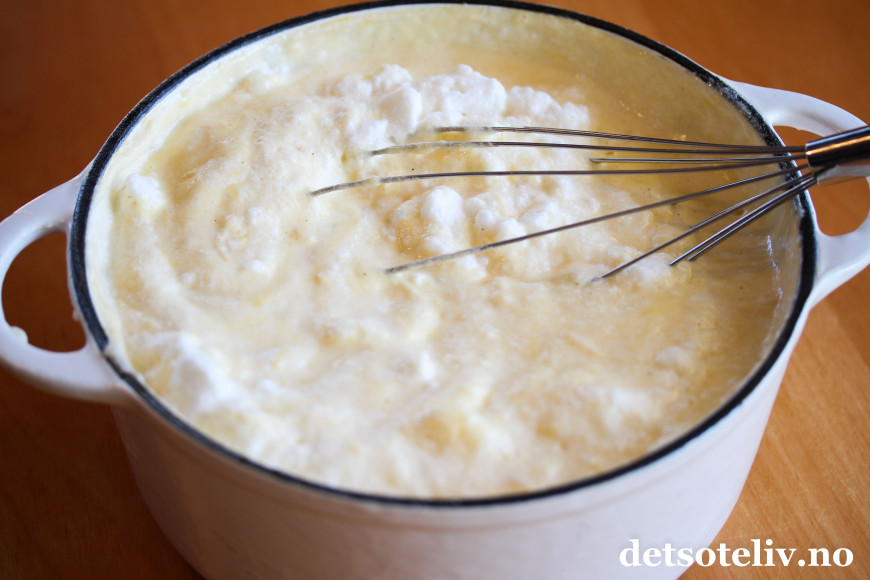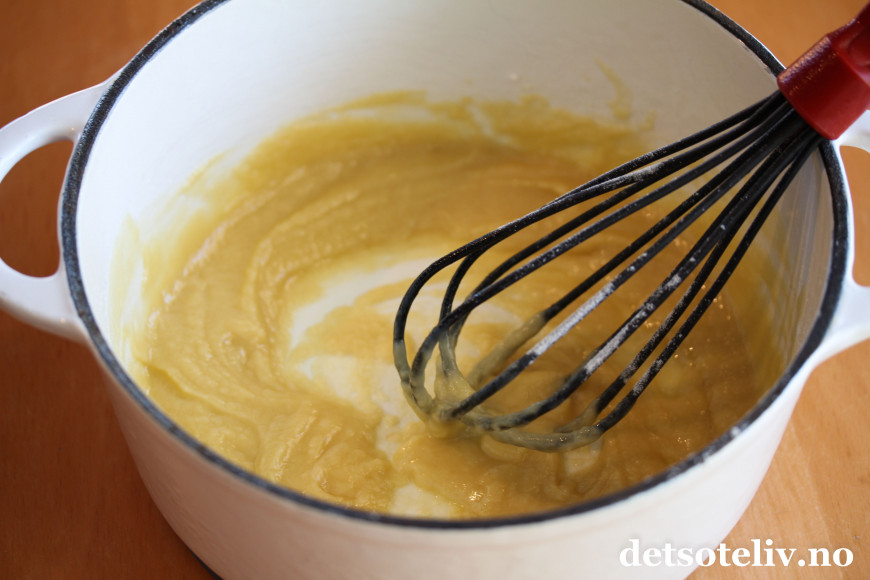 Du vil se at osten begynner å smelte. Rør ofte slik at blandingen ikke setter seg fast i bunnen av kjelen. Ta kjelen av platen.