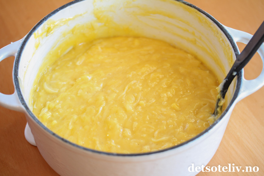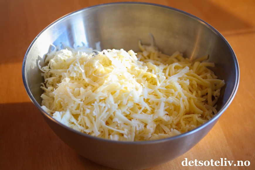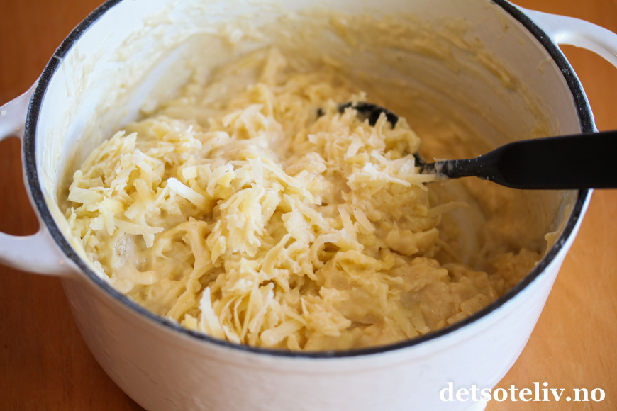 Skru ned varmen på platen. Bland revet ost i den hvite sausen og rør godt. Du vil se at osten begynner å smelte. Rør ofte slik at blandingen ikke setter seg fast i bunnen av kjelen. Ta kjelen av platen.