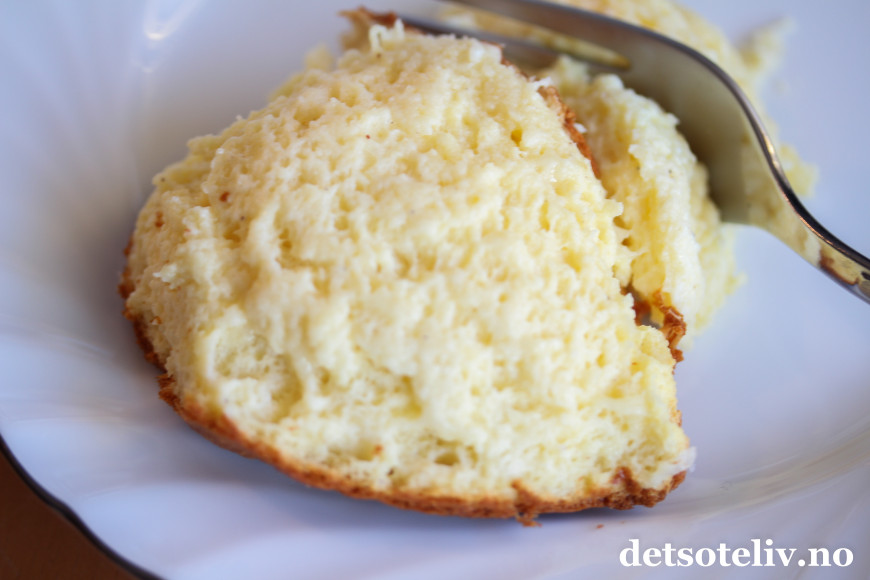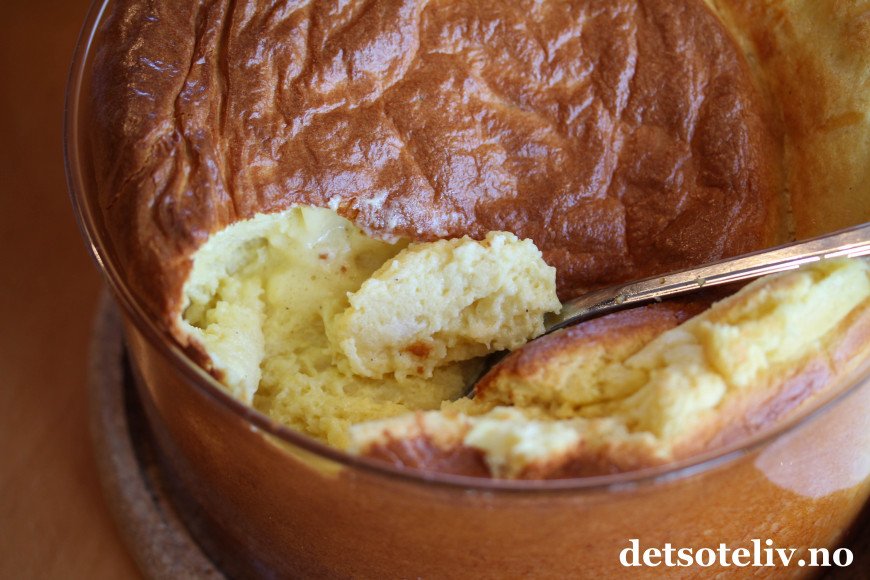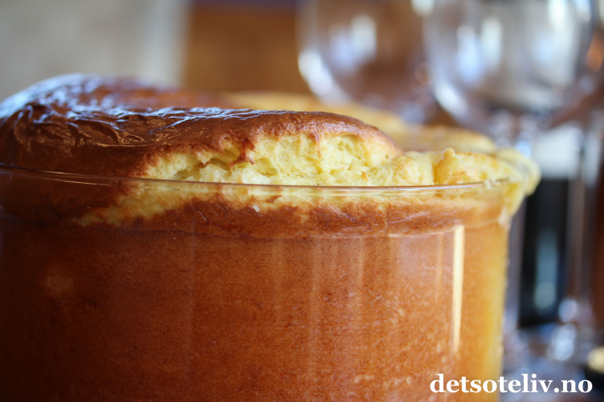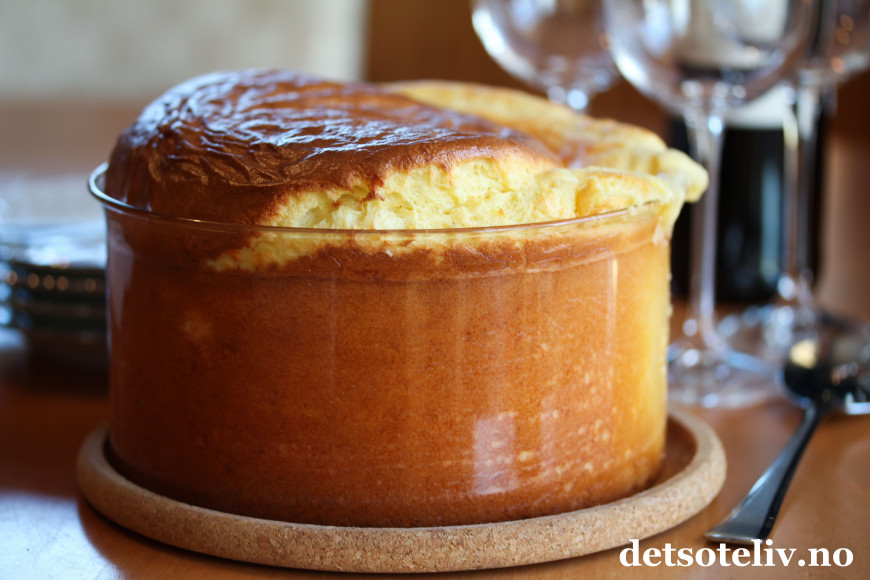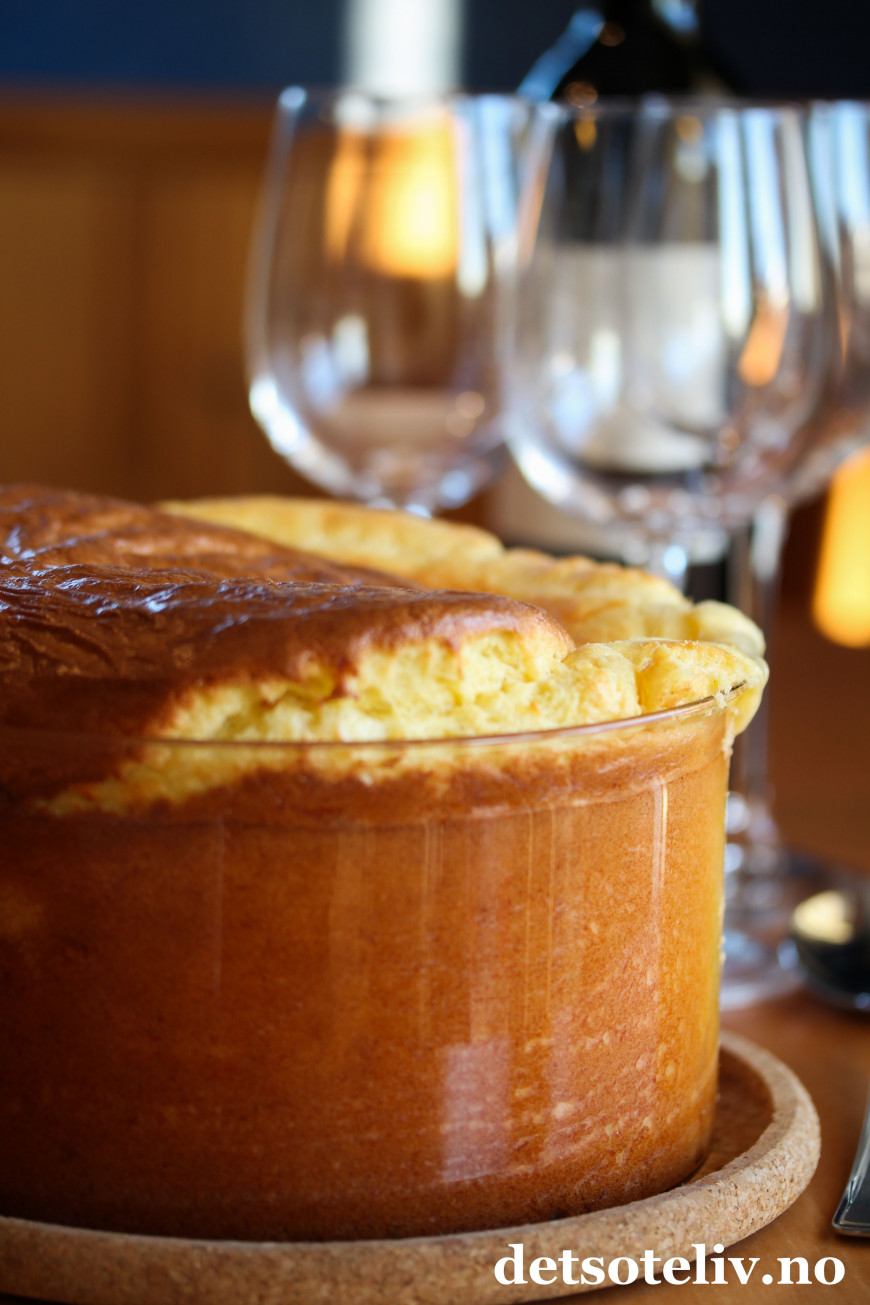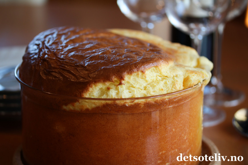 Ikke bli skuffet over at ostesuffléen puffer litt sammen når man begynner å forsyne seg..