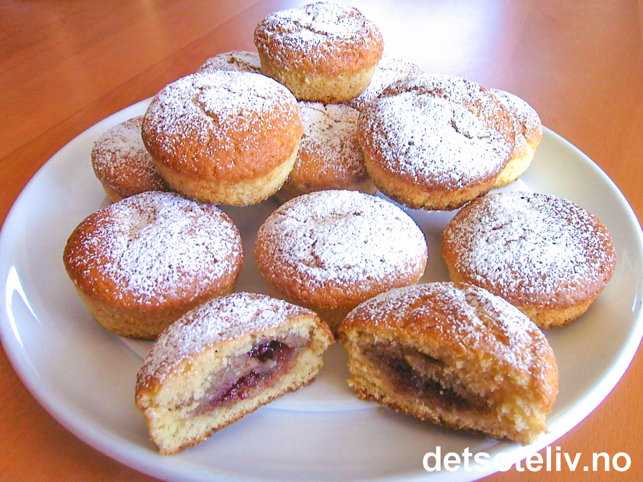"Overraskelsesmuffins" er fine å fryse! Sikt over litt ekstra melis rett før servering, slik at de ser ferske ut!