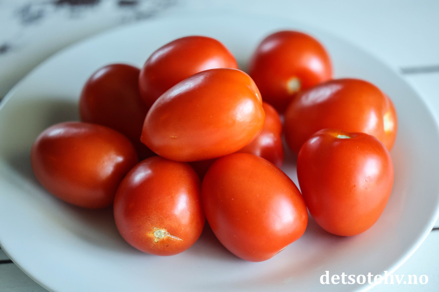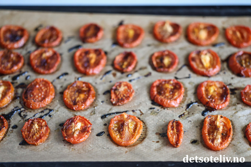Bak tomatene midt i ovnen ved 135°C i 2 timer.