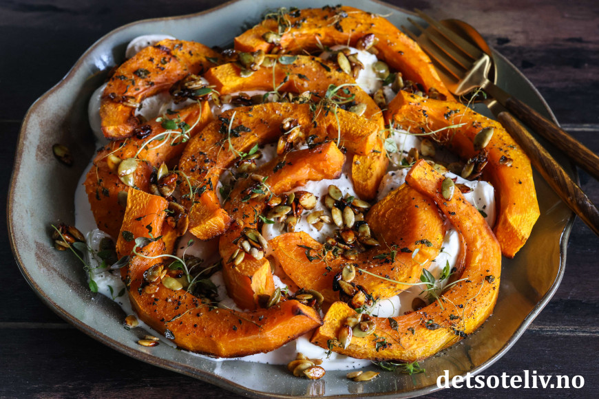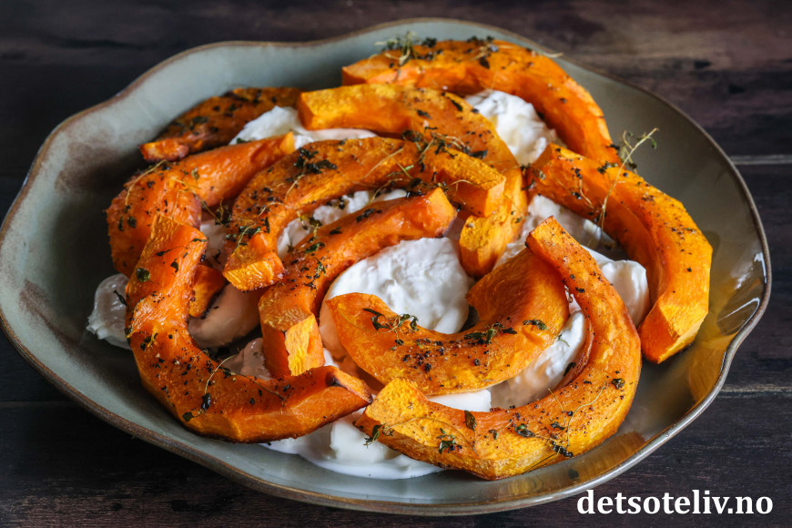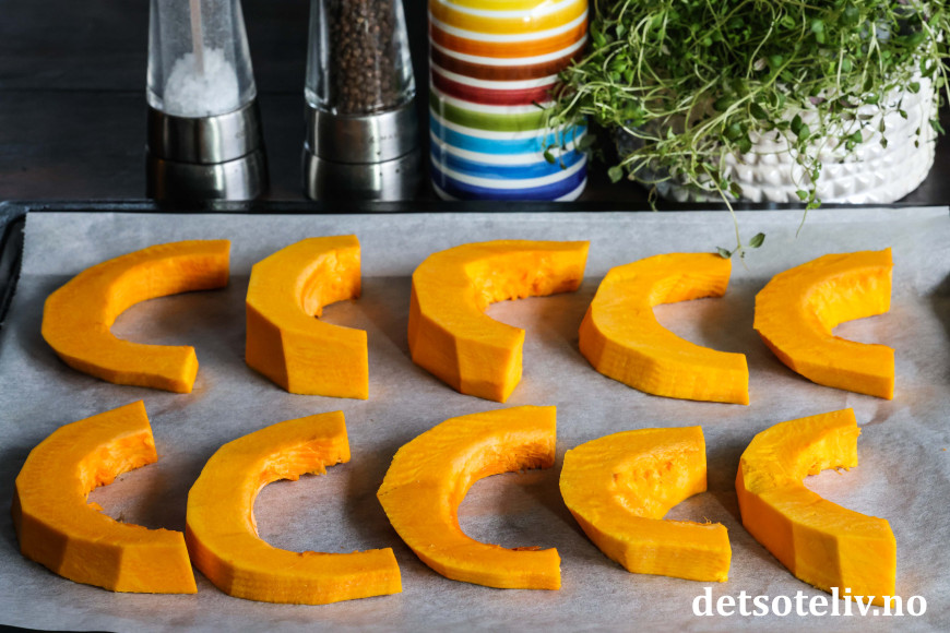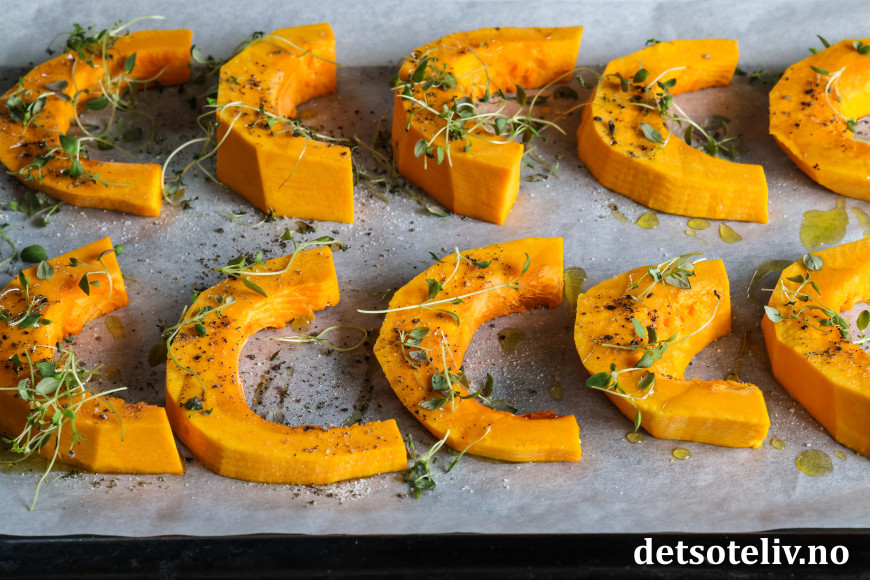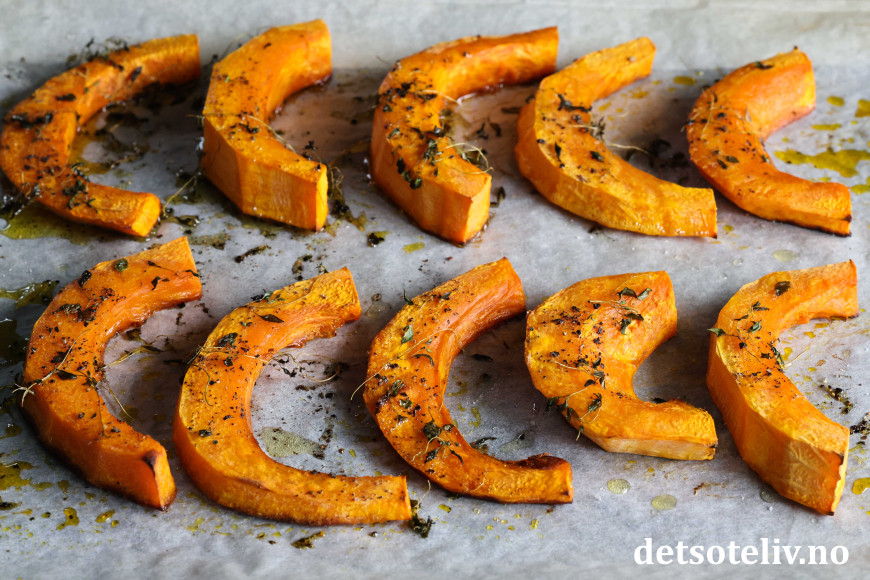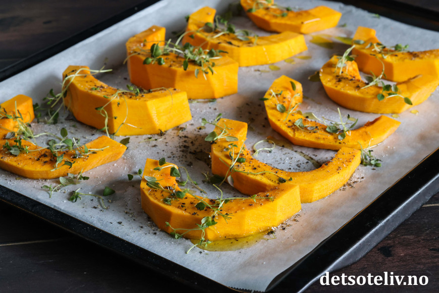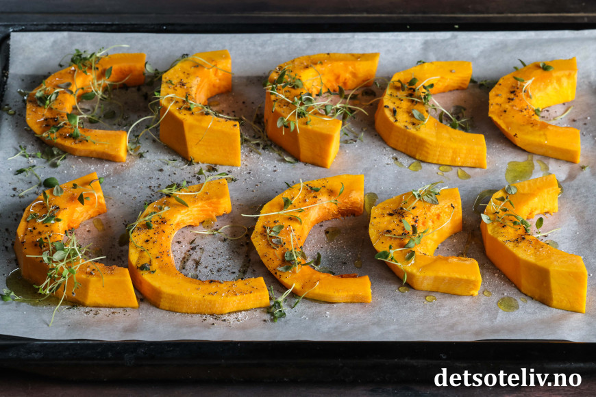 Først bakes tykke skiver av gresskar i ovnen med olivenolje, timian og salt og pepper.