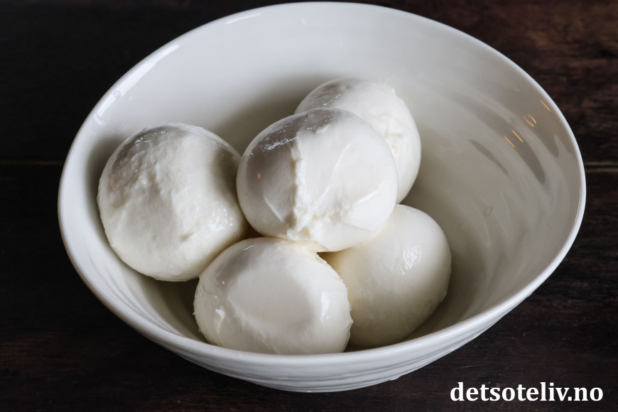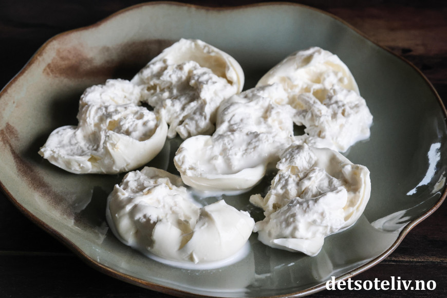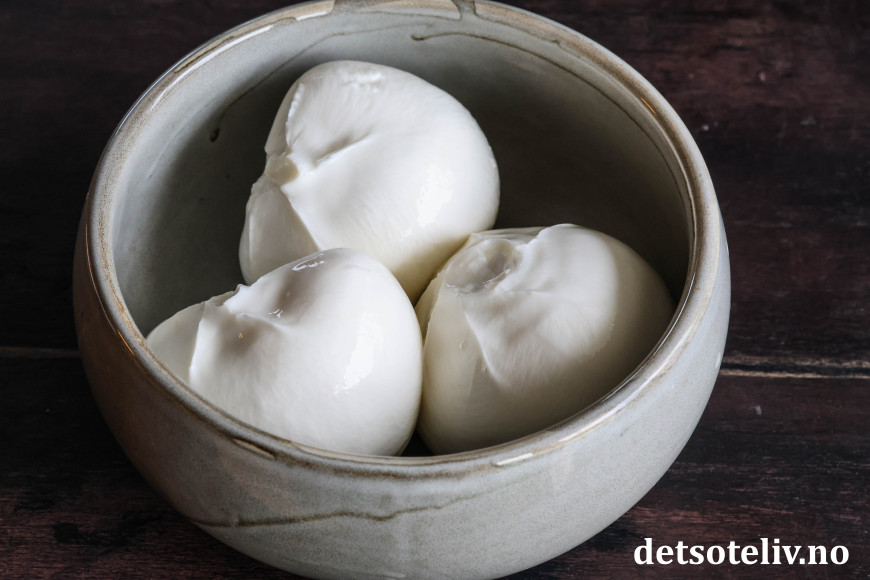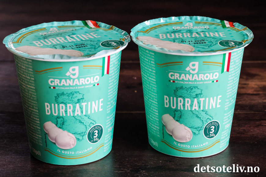♥ Burrata er en italiensk ferskost som består av fast mozzarella som fylles med en kremete ostemasse som lages av revet, fersk mozzarella og fløte (fyllet kalles for "stracciatella"). På samme måte som fersk mozzarella, ligger burrata i lettsaltet vann når du kjøper den.