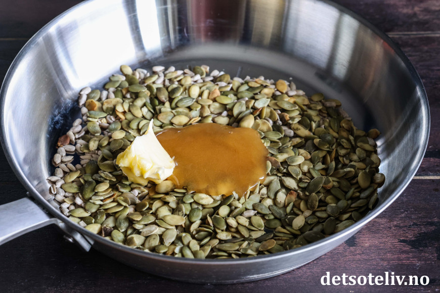 Ha solsikkekjerner og gresskarkjerner i en stekepanne sammen med smør og honning.