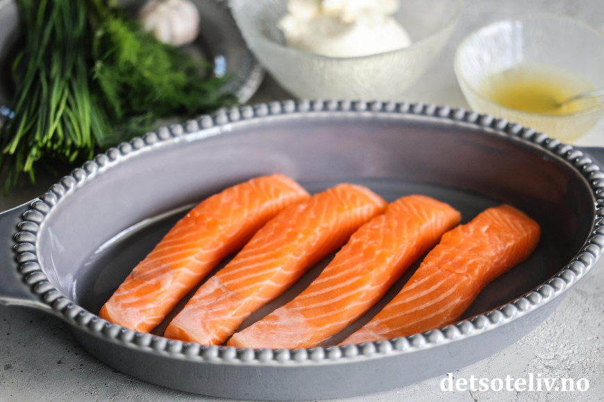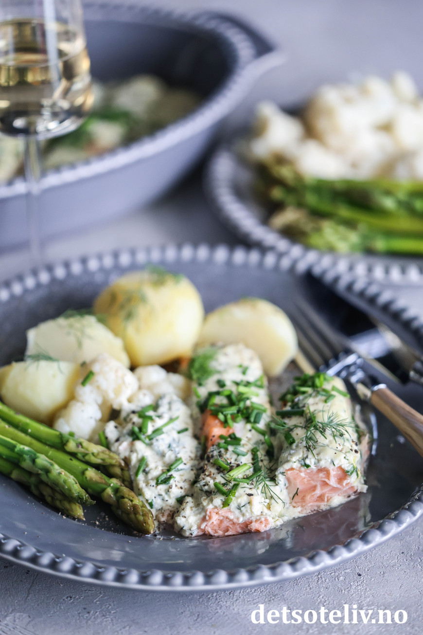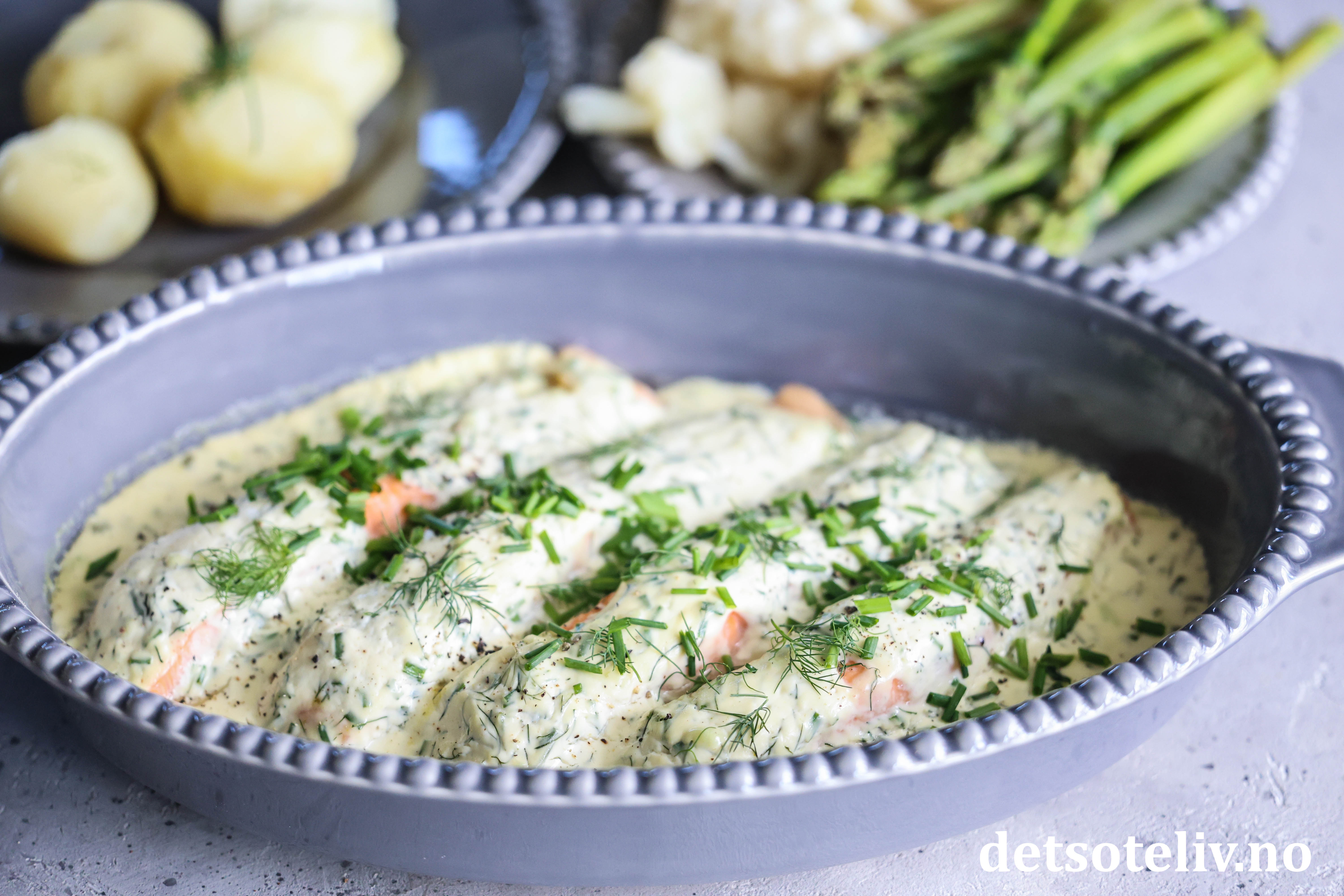 Laksefileter legges i en ildfast form og dekkes med en deilig, kremet saus laget av crème fraîche, hvitløk og urter. Mens laksen står i ovnen koker du poteter og noen grønnsaker, som for eksempel blomkål og grønne asparges.