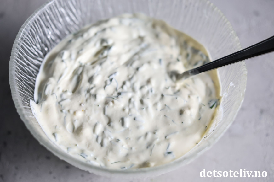Ha crème fraîche i en skål og tilsett pressede hvitløksfedd.