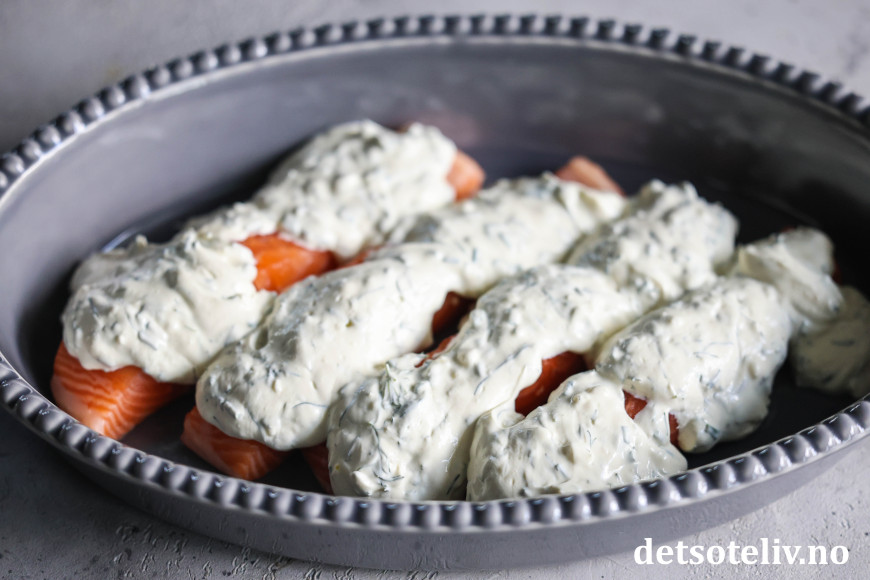 Fordel crème fraîche-sausen over laksefiletene. Kvern over litt ekstra salt og pepper.