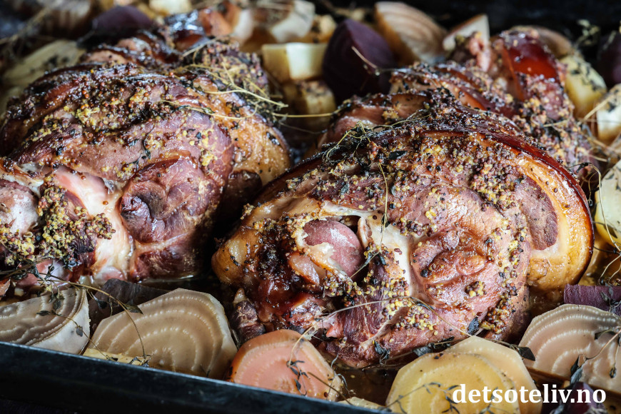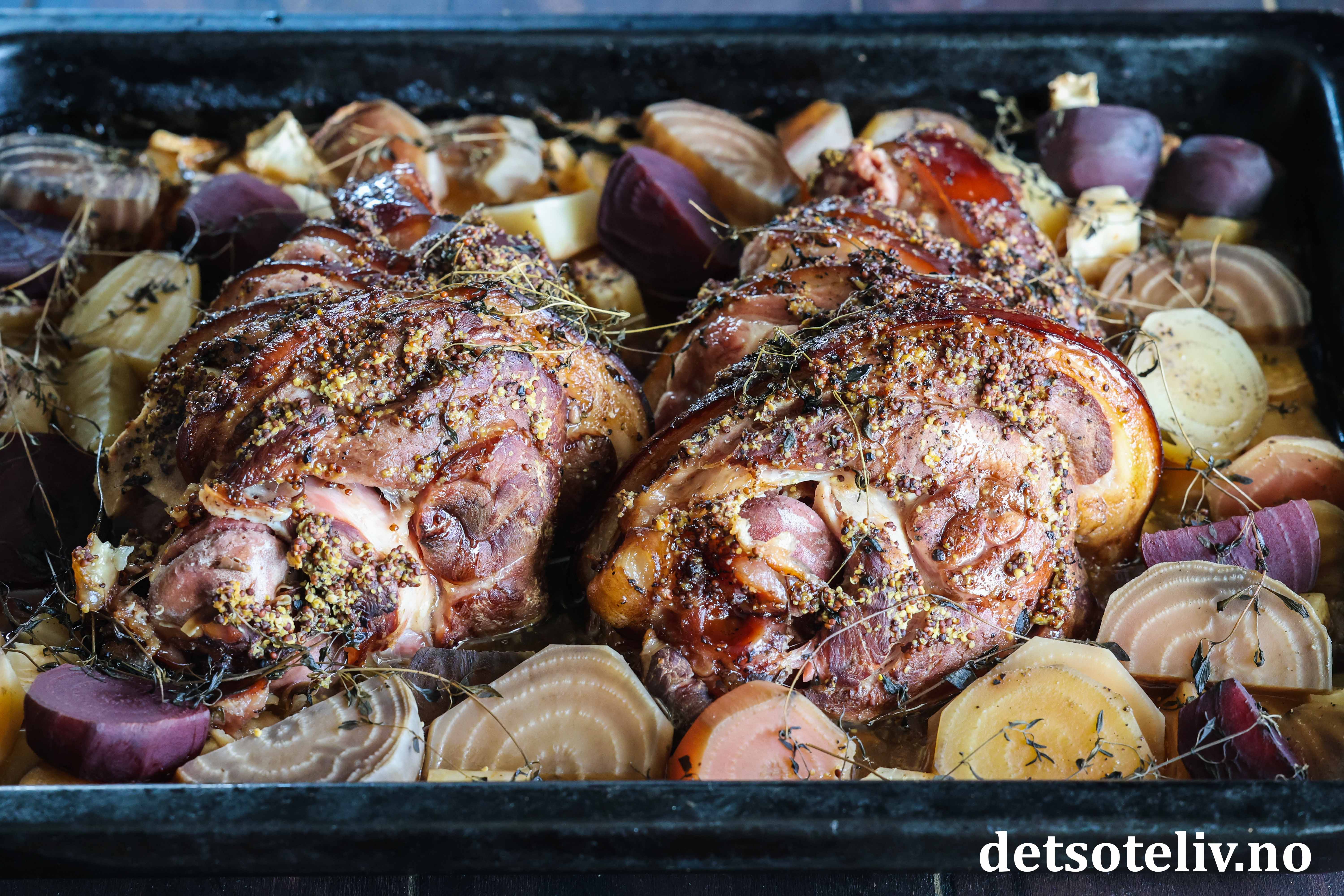 Jeg gnir knoken inn med pepper og grov sennep, ovnsbaker den i eplemost og pensler med honning etter steking. Langpannen kan fylles opp med rotgrønnsaker som ovnsbakes sammen med kjøttet. Jeg serverer i tillegg kokte poteter og hjemmelaget Kålrotstappe som tilbehør, og lager en deilig Fløtesaus på den gode kraften i langpannen.