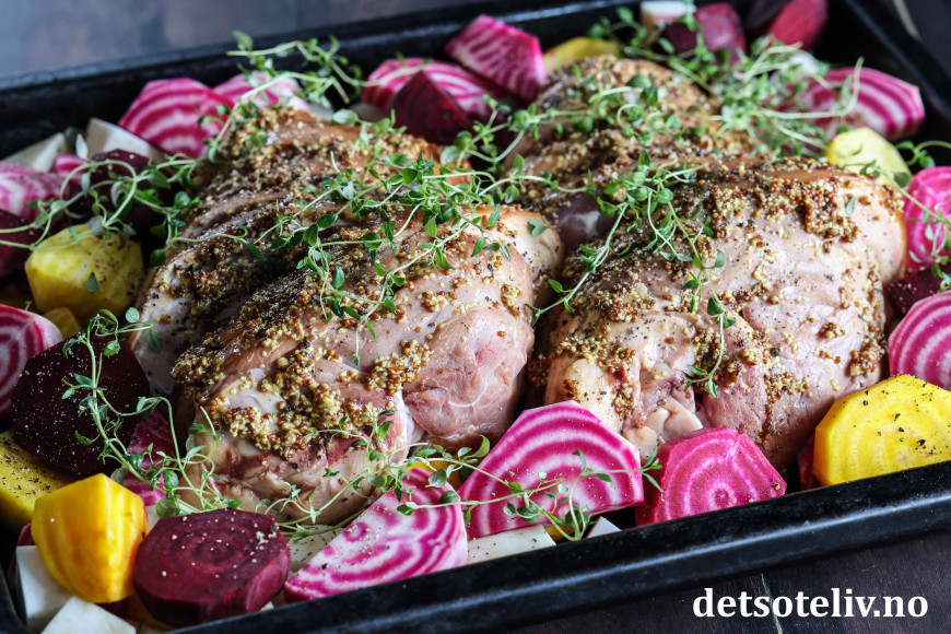 Legg knokene i en stor langpanne. Smør over litt honning, grov sennep og kvern over pepper.