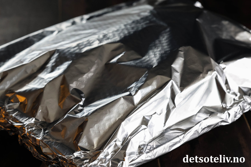 Dekk langpannen med aluminiumsfolie og klem til langsmed kantene slik at folien ligger tett rundt langpannen.