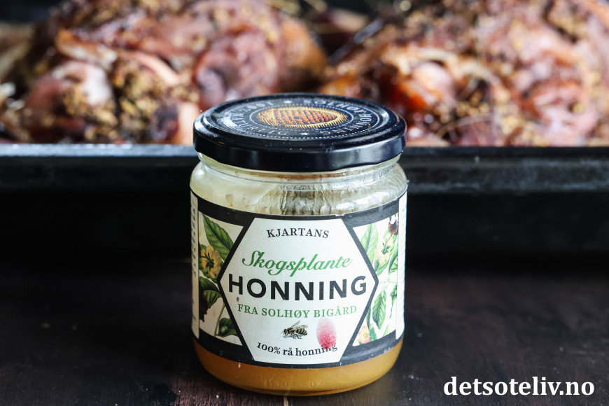 Smør et godt lag med honning på hver svineknoke. Ha litt vann i langpannen og sett den tilbake i ovnen. Øk varmen til 220°C og la svineknokene stå i ovnen uten aluminiumsfolie i ca. 30 minutter til.