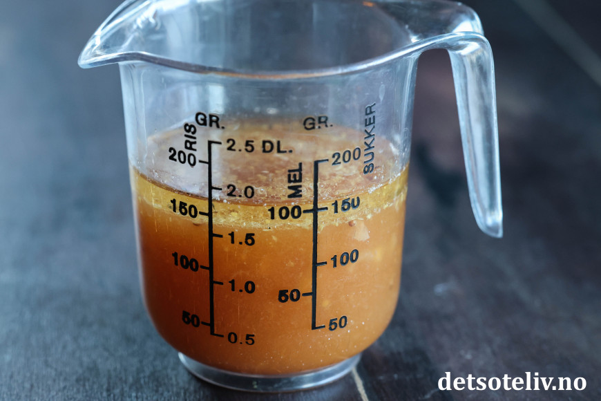 Sil av kraften i langpannen (kraften har mye smak av kjøttet, rotgrønnsakene, eplemost, sennep og honning og skal brukes til saus, se nedenfor).