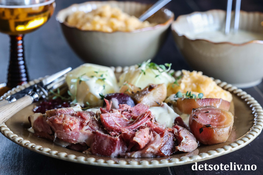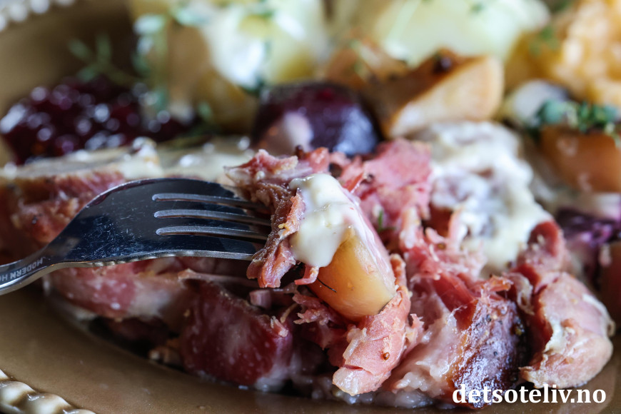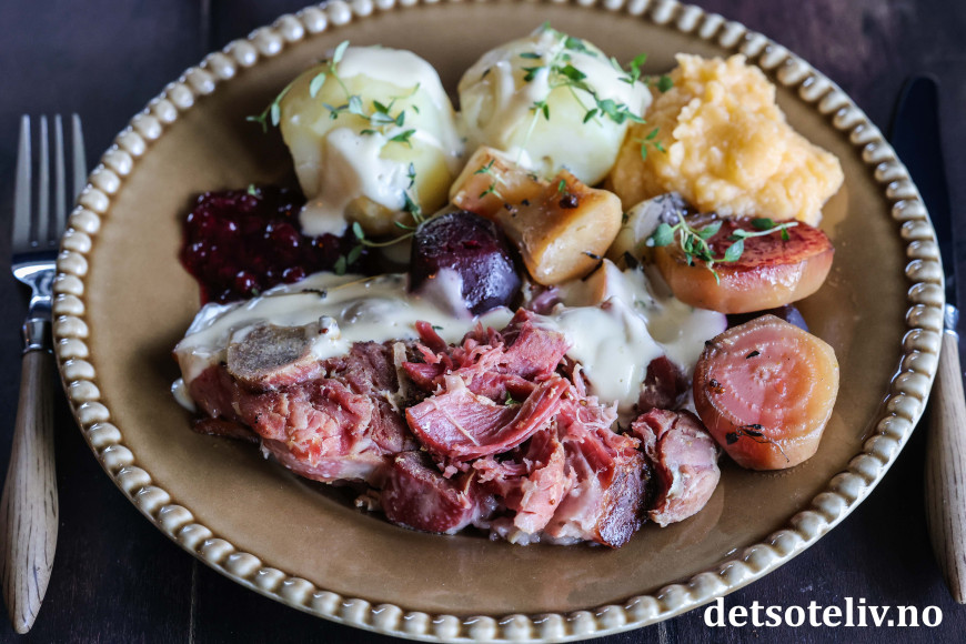 Fjern mesteparten av skinn og fett fra knokene. Server det møre kjøttet sammen med ovnsbakte rotgrønnsaker, kokte poteter, hjemmelaget kålrotstappe, den gode fløtesausen og tyttebærsyltetøy.