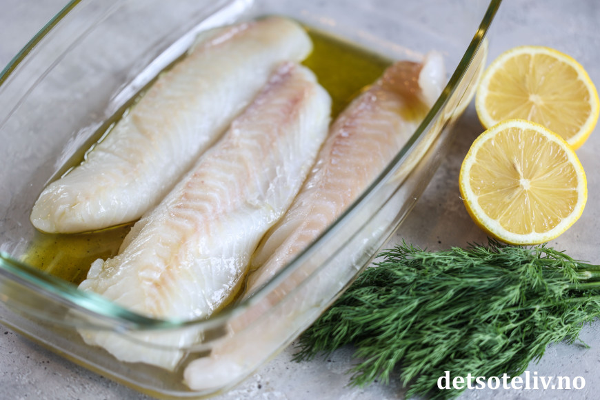 Legg fiskefiletene i en ildfast form. Hell olivenoljen i formen.