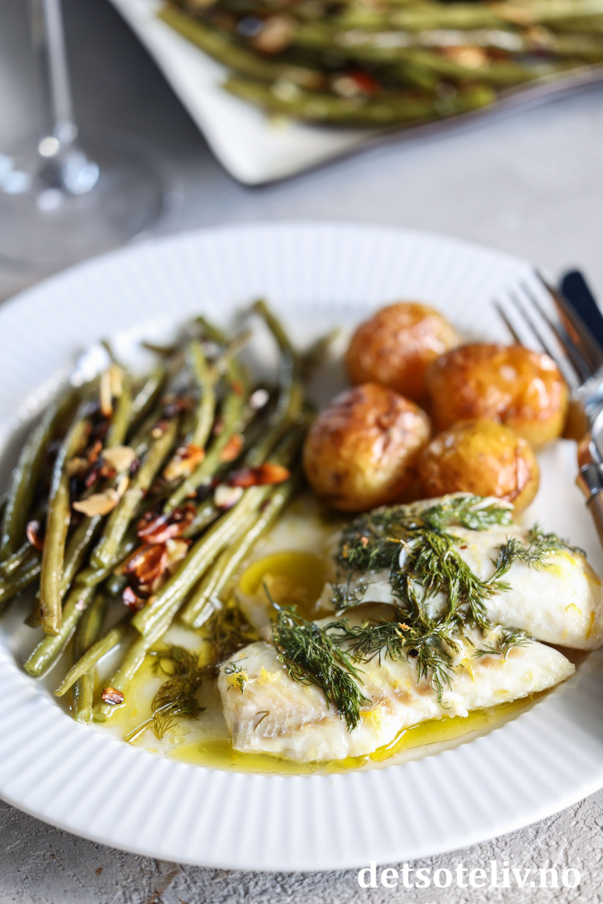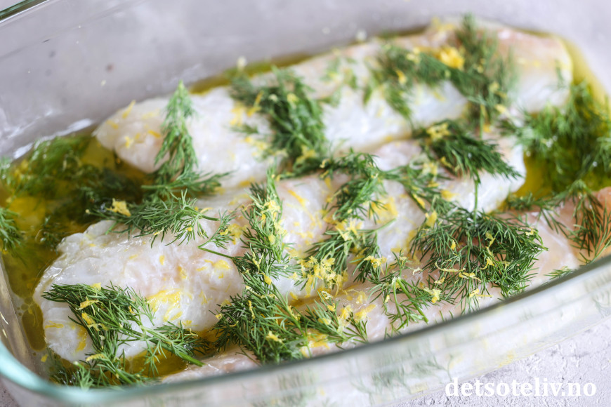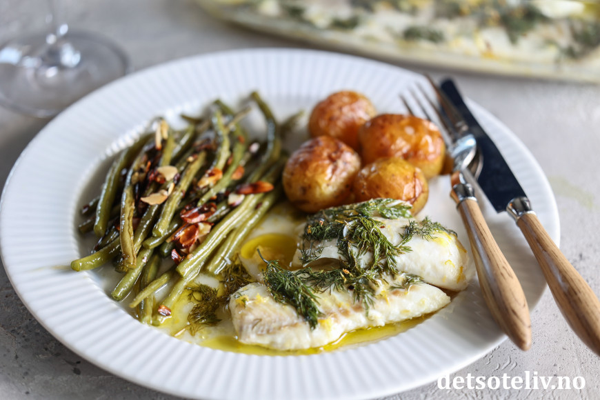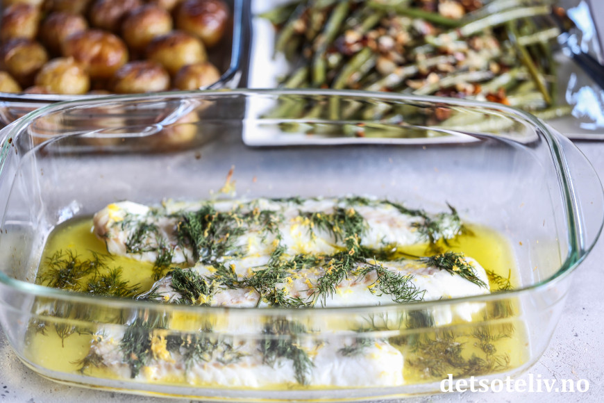 Jeg bruker her fersk torskefilet (loin), som jeg baker i ovnen sammen med olivenolje, hvitløk, sitron og masse frisk dill.