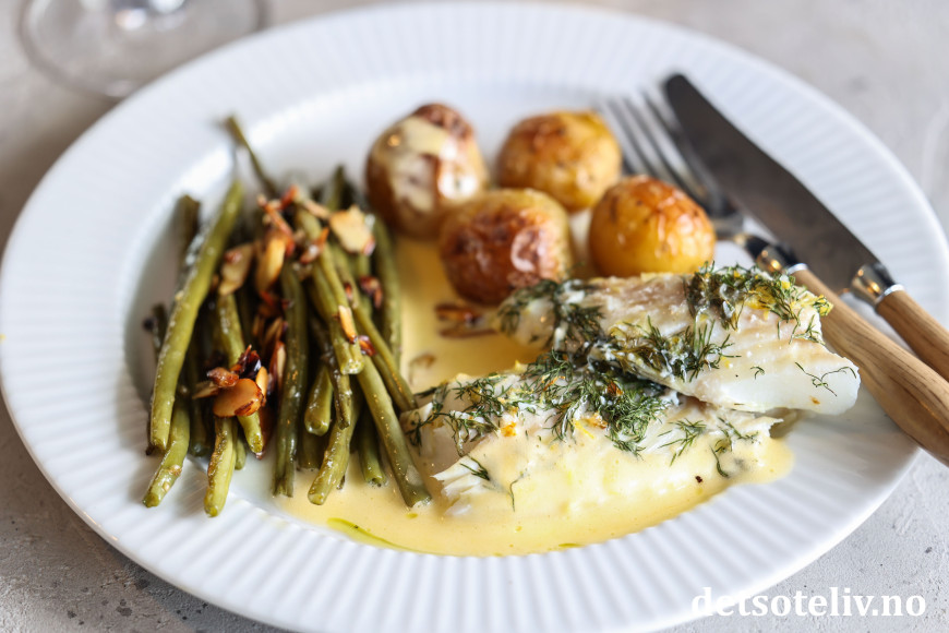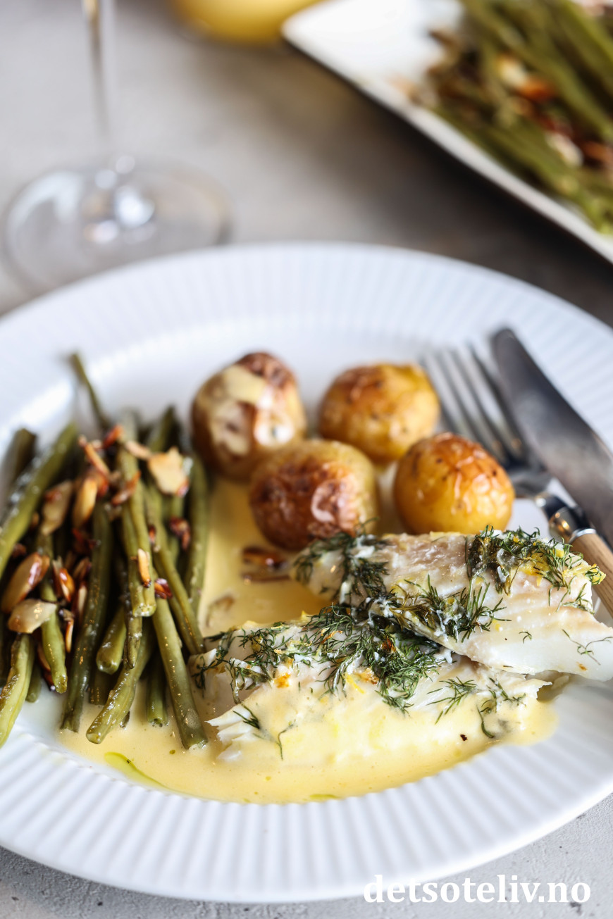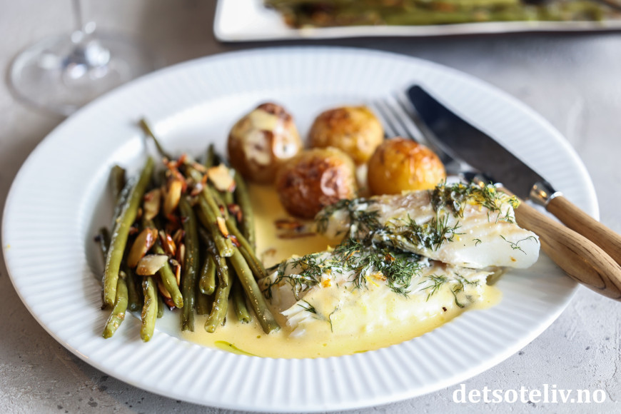 Forslag til tilbehør er aspargesbønner med mandler, ovnsbakte småpoteter og hjemmelaget hollandaisesaus.