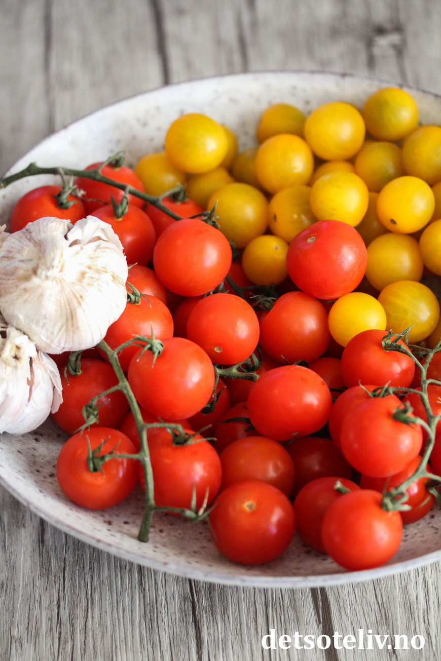 ♥ Det ser lekkert ut hvis du bruker en kombinasjon av røde og gule tomater, men det er ikke nødvendig.