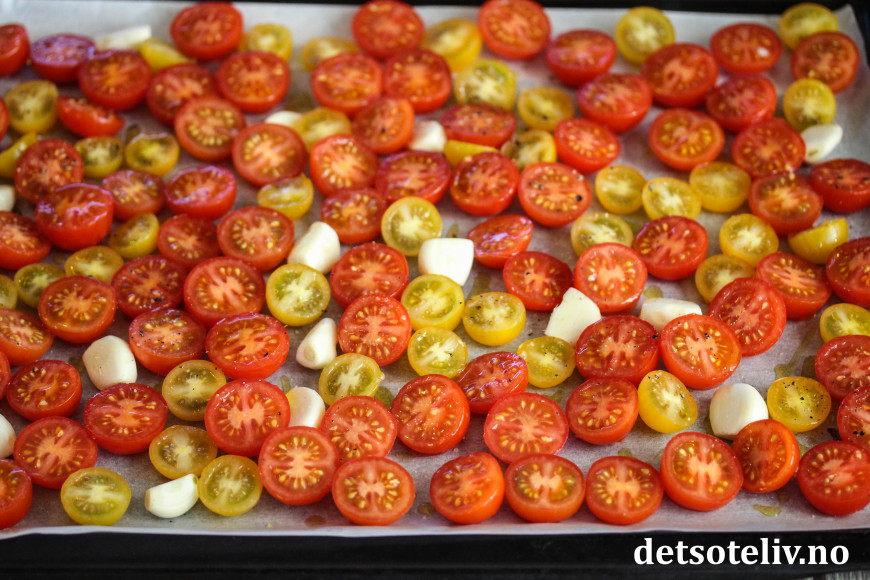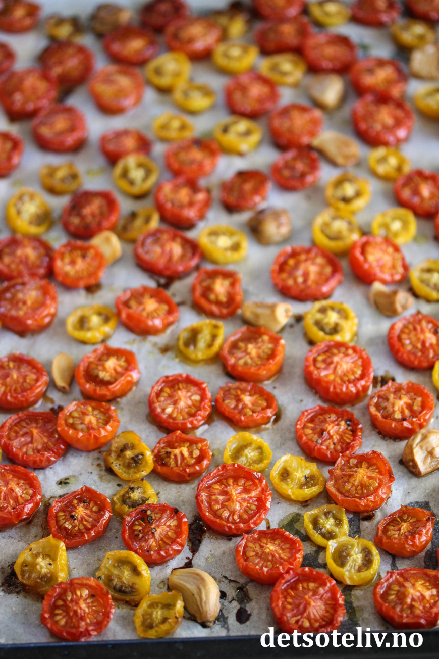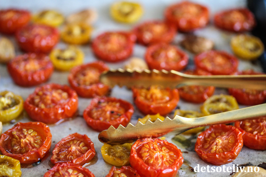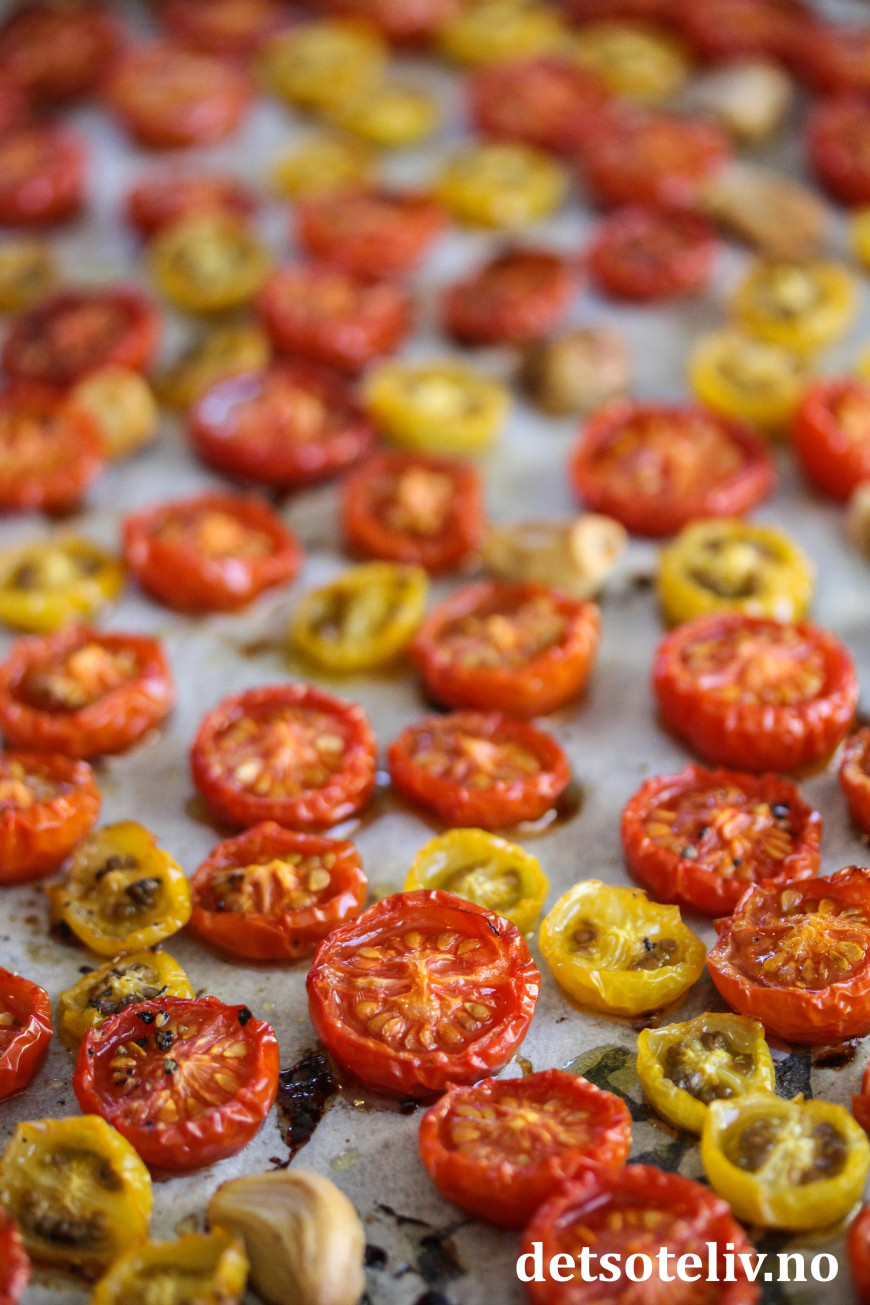 Når cherrytomater bakes i ovnen på lav varme over lang tid, konsentreres smaken og de blir fantastisk søte og gode!