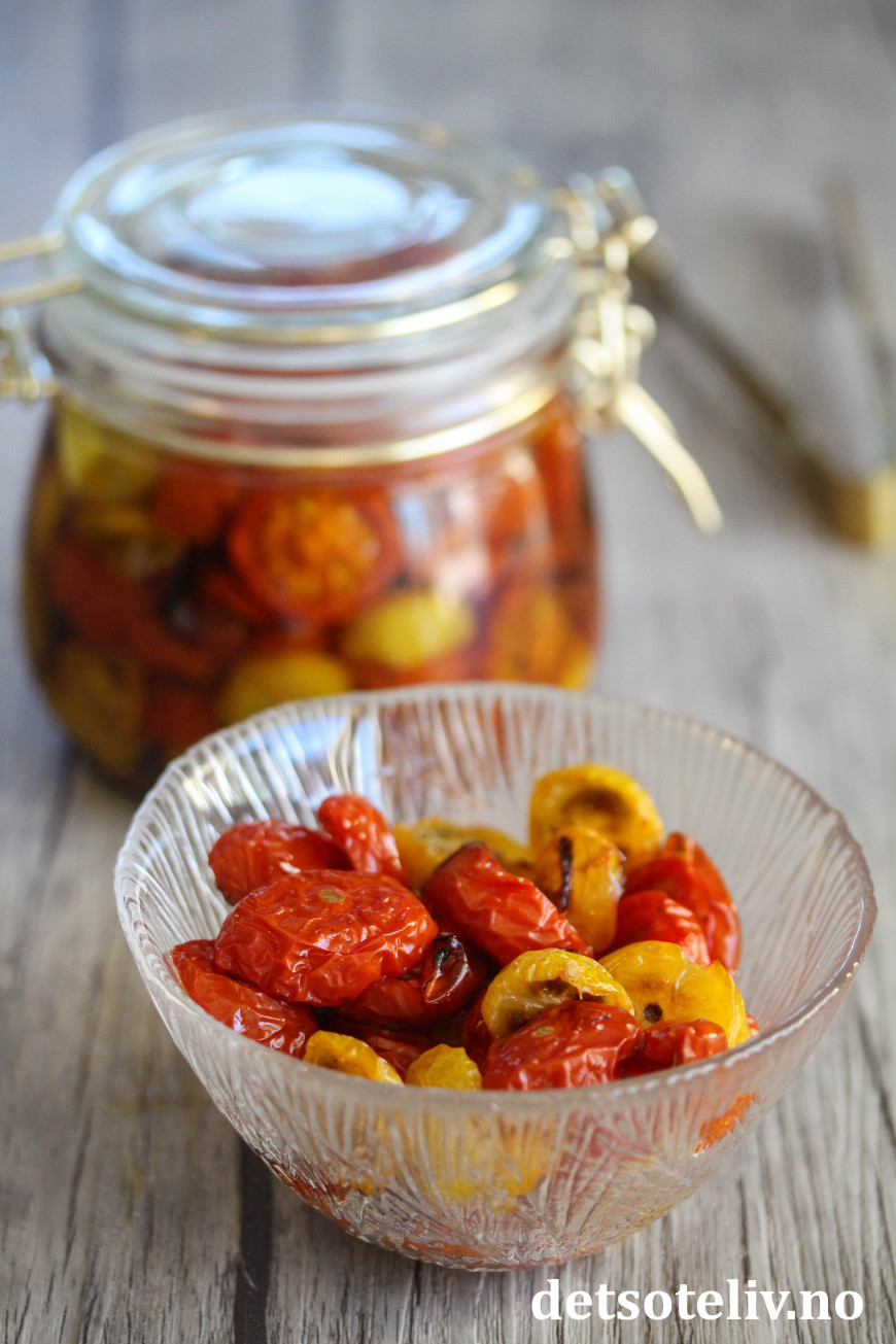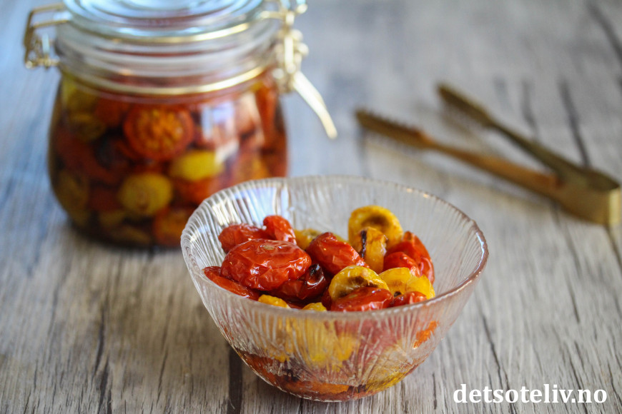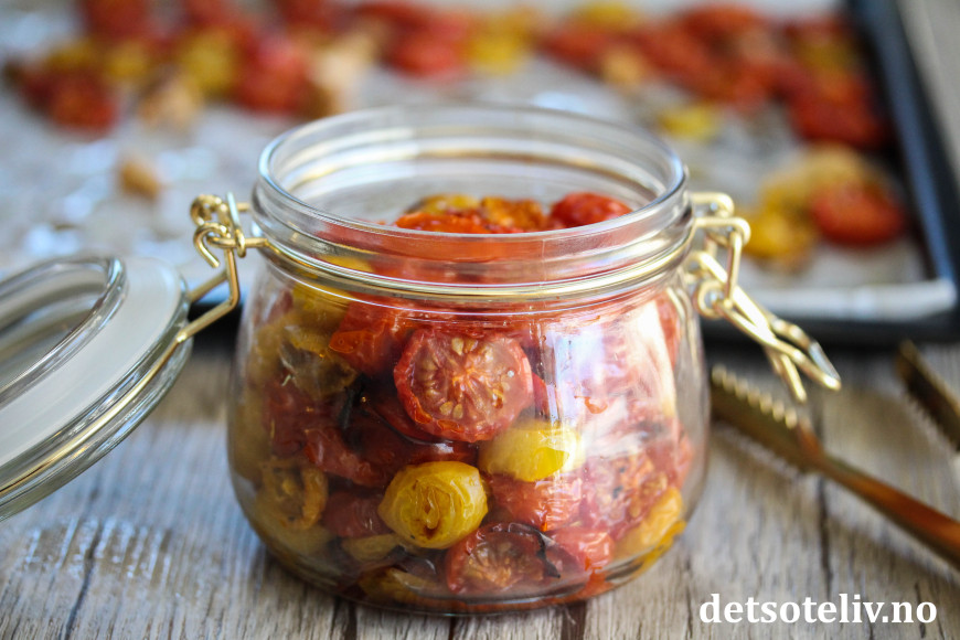 ♥ På glass med olje holder de ovnsbakte tomatene seg i flere uker i kjøleskapet.