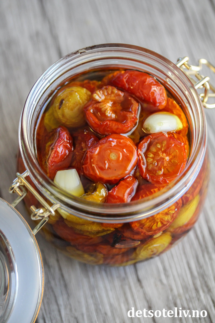 Ha gjerne også et par ferske hvitløksfedd i glasset. Hell god olivenolje på glasset slik at tomatene blir dekket.