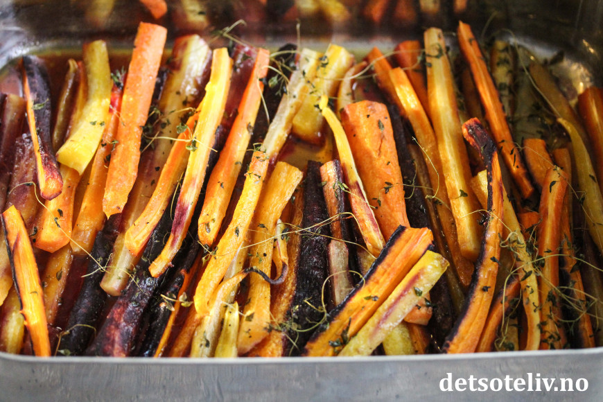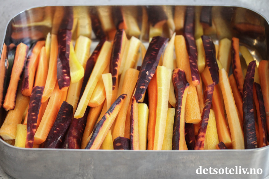 ♥ Steketiden er også veiledende, avhengig av hvor tykke gulrotstavene dine er, så følg med. Kjenn etter om gulrøttene er myke med en gaffel og vend eventuelt litt rundt på dem underveis i steketiden slik at de blir jevnt stekt.