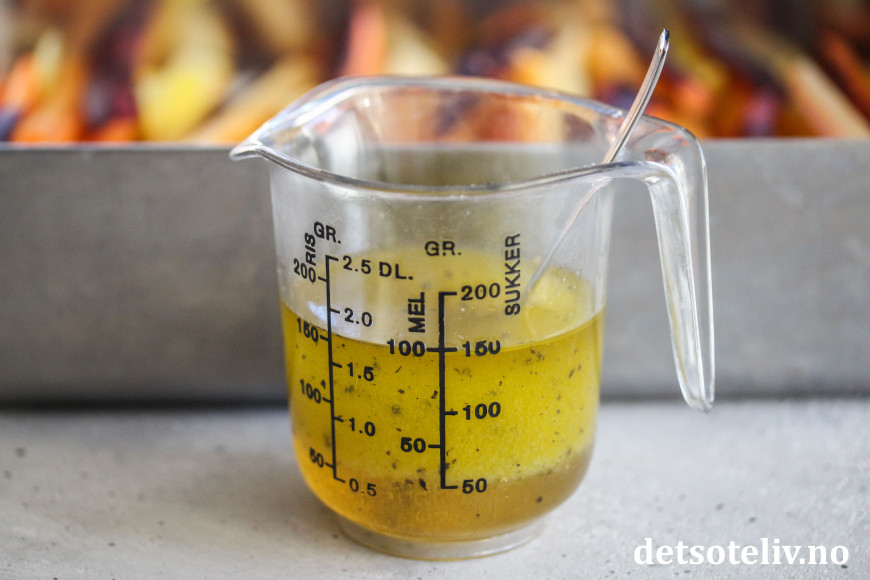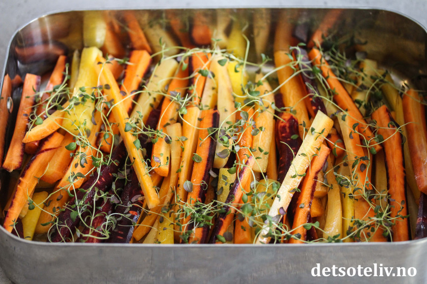 ♥ Mengdeangivelsen er omtrentlig. Du kan bare legge de gulrøttene du har i formen og helle over olje, honning, presset sitron osv. etter ønske.