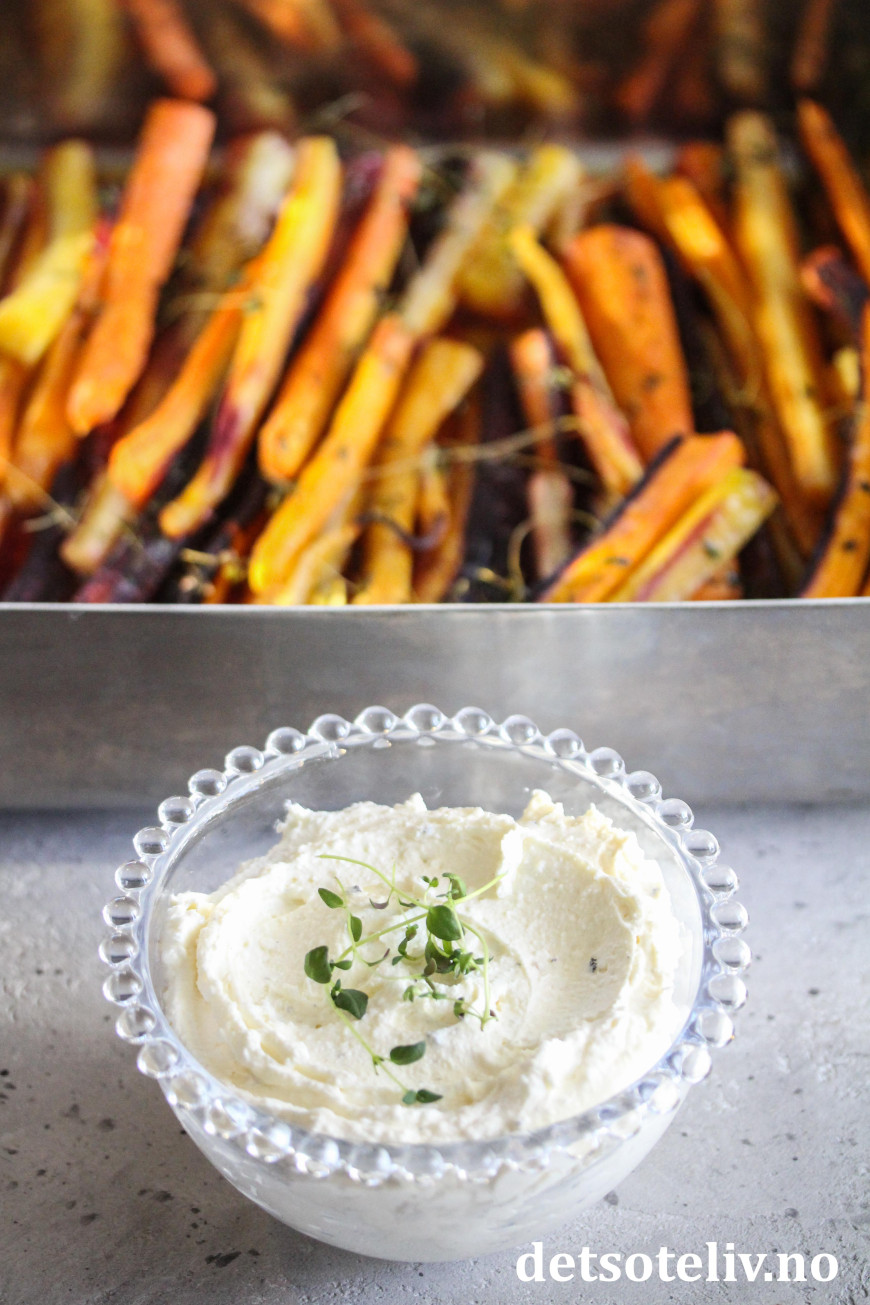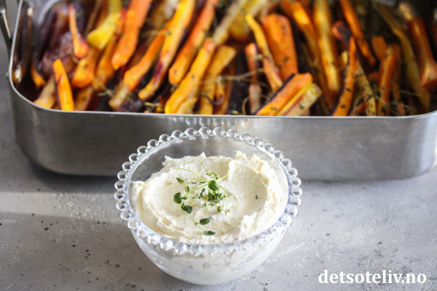 Ha fetakremen i en skål og server den sammen med de varme gulrøttene.