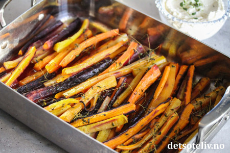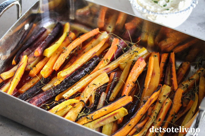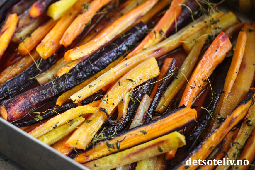 Ovnsbakte gulrøtter en kjempegodt tilbehør til mange retter, og er også veldig godt alene som en varm lunsjrett eller sammen med salat.