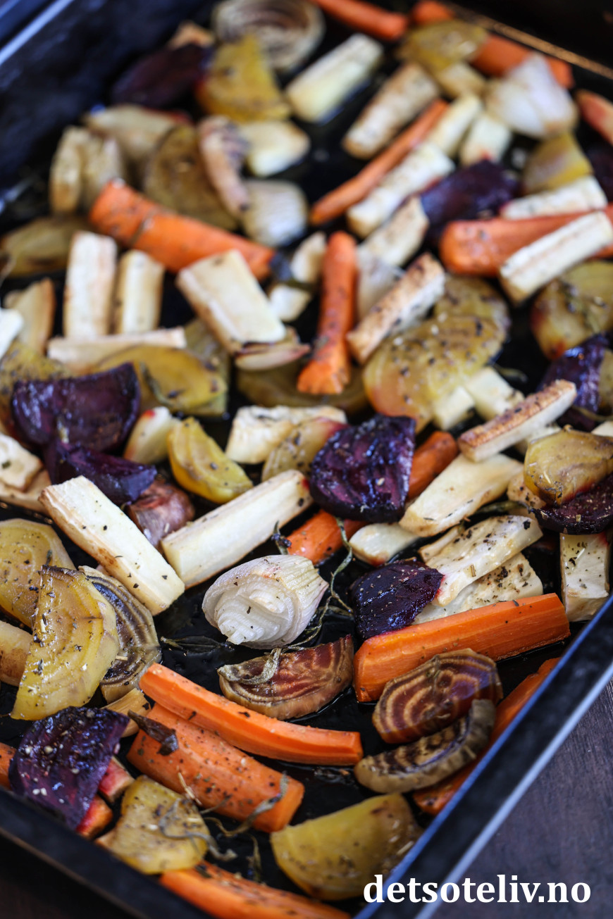 Stek rotgrønnsakene midt i ovnen ved 200°C i ca. 30 minutter.