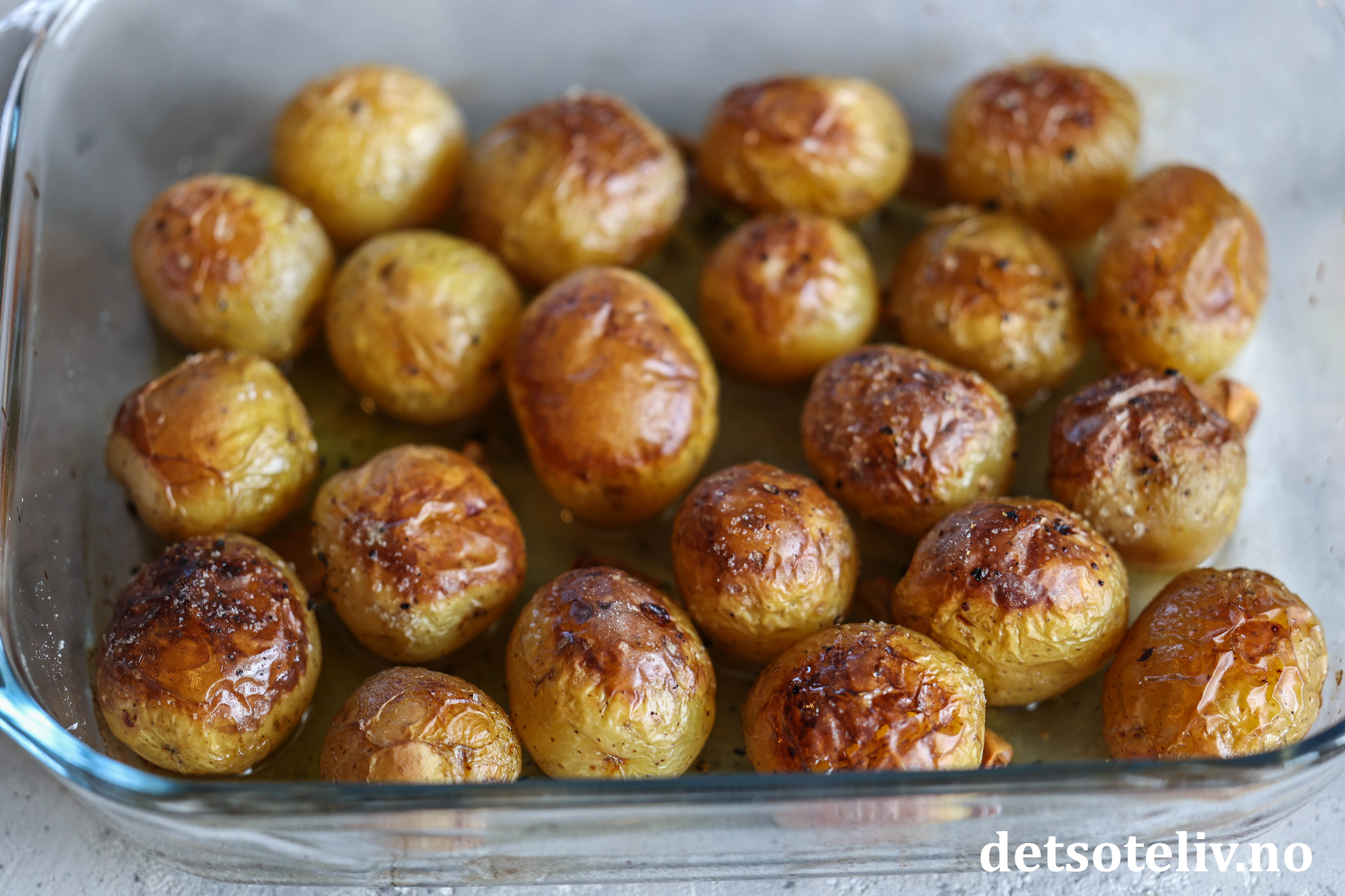 Legg potetene i en liten, ildfast form (den jeg bruker her måler ca. 18 x 25 cm).