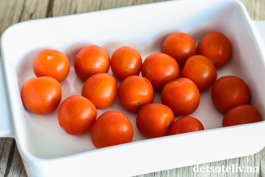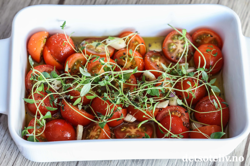 Små, søte cherrytomater blir ekstra gode når de ovnsbakes med olivenolje, hvitløk og timian.